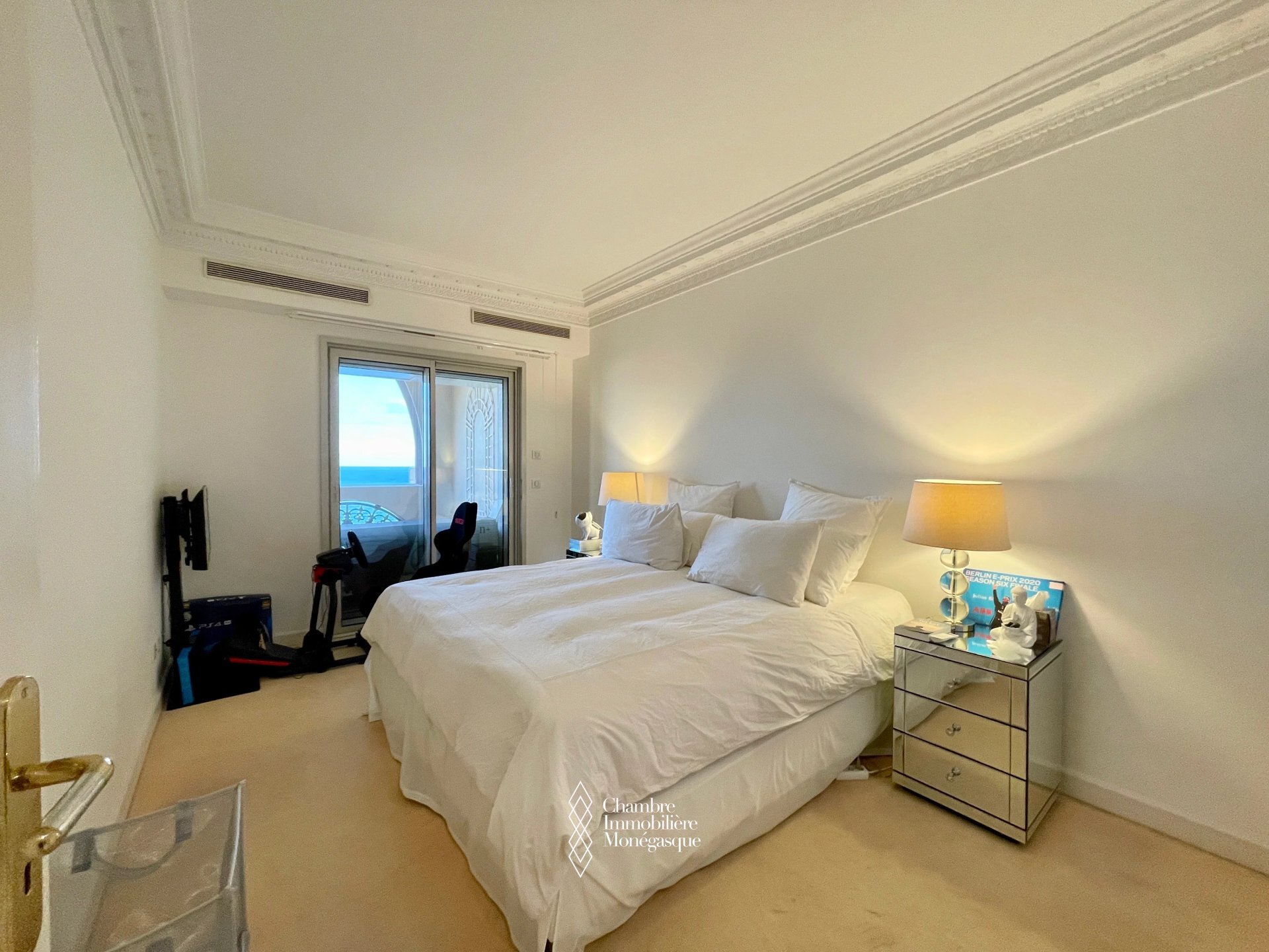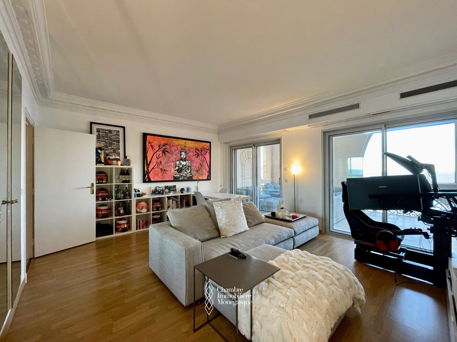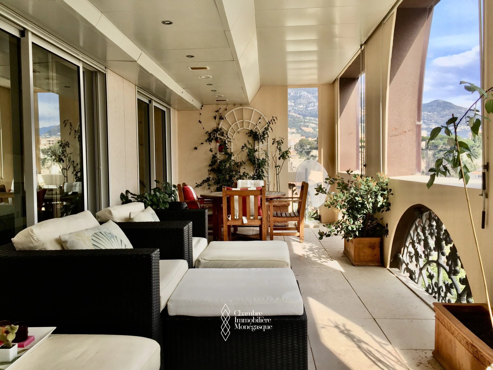 On a high floor, facing East, the apartment enjoys a lovely view of the Gardens and the Sea. In excellent condition, it includes an entrance hall, a guest WC, a separate fitted kitchen, a hallway with dressing room, a double living room with storage opening onto a superb 31.50m2 terrace, a bedroom with storage also opening onto the terrace as well as a shower room with WC.