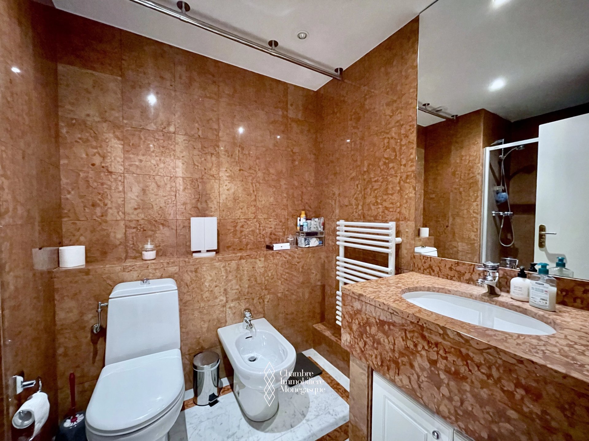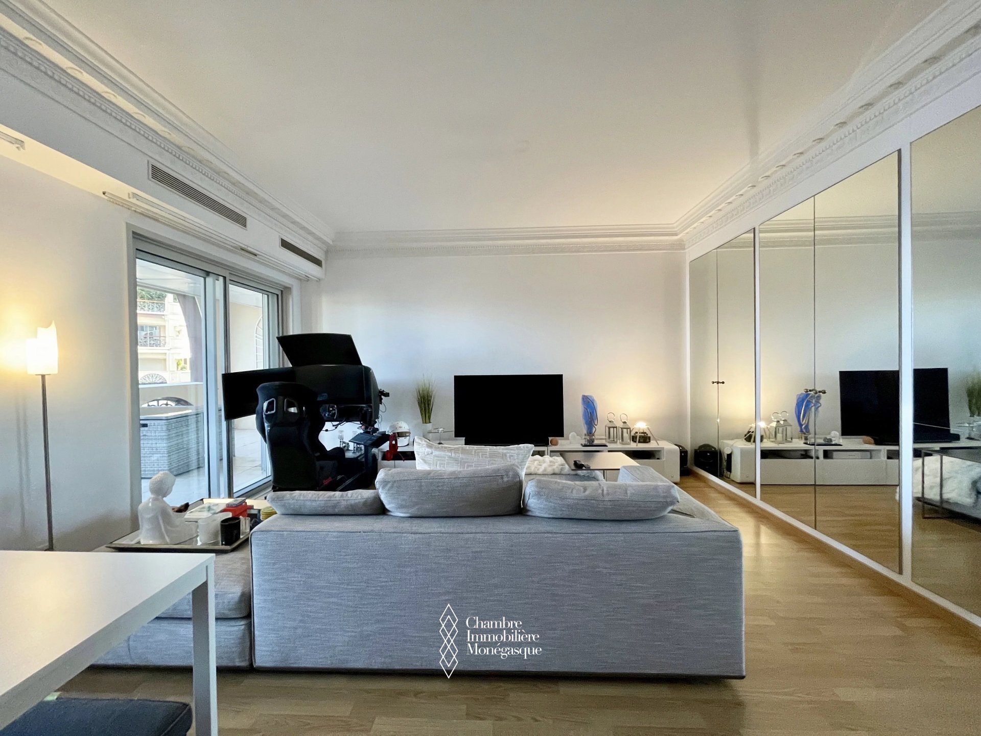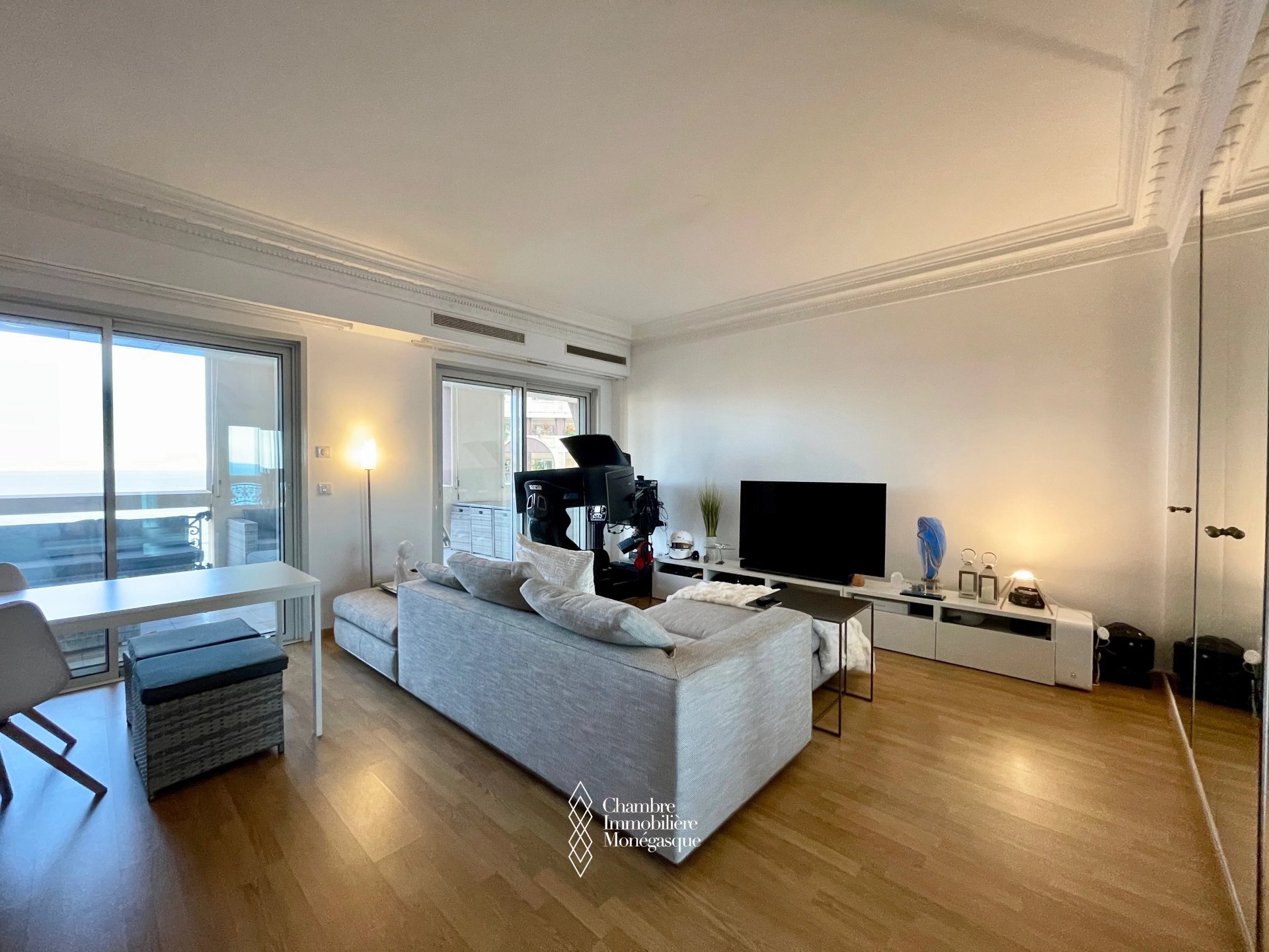 On a high floor, facing East, the apartment enjoys a lovely view of the Gardens and the Sea. In excellent condition, it includes an entrance hall, a guest WC, a separate fitted kitchen, a hallway with dressing room, a double living room with storage opening onto a superb 31.50m2 terrace, a bedroom with storage also opening onto the terrace as well as a shower room with WC.