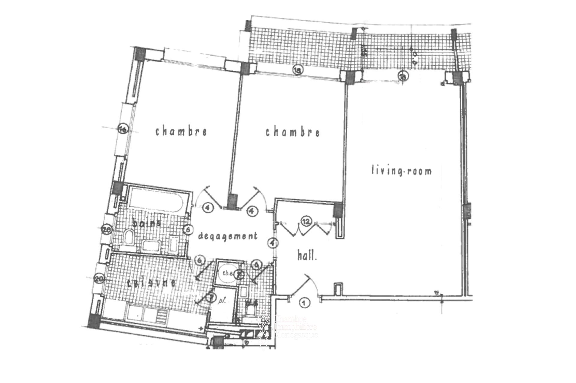 Elegant three-room apartment in the Monte Carlo district, recently renovated and furnished, with great taste, in a contemporary style. In a bourgeois residence, this apartment of approximately 96 m² of total surface area, including 87 m² of living space and 9 m² of terrace, consists of an entrance, a living room opening onto the loggia, a guest toilet, an independent kitchen, two bedrooms, and a bathroom.