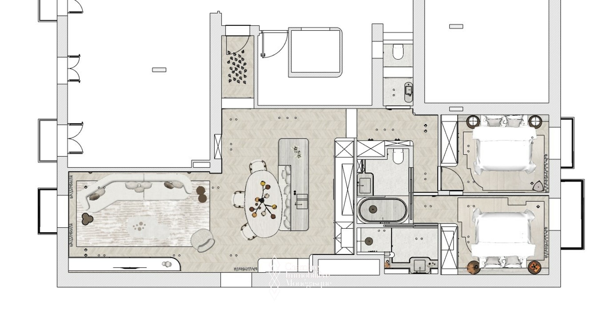 This exquisite 2-bedroom apartment is ideally located in the Ambassador building, on the boulevard des Moulins. Spanning 118.53m² of refined living space, complemented by a 4.59m² terrace, the property provides elegance, comfort, and contemporary style.