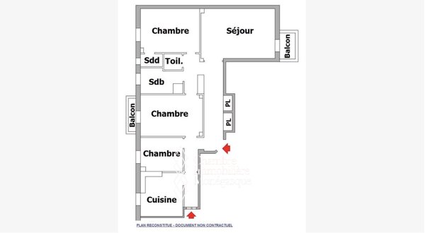 This four-room apartment features an entrance hall, a living room opening onto a balcony, a separate fully equipped kitchen, three bedrooms, two shower rooms (one with a toilet), and a separate guest toilet.