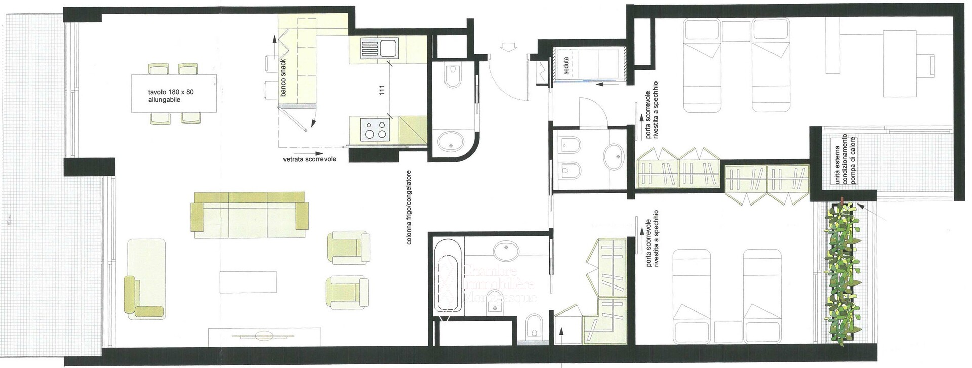 It features a spacious living area opening onto a terrace with a beautiful sea view, a fully equipped kitchen, two bedrooms, and two bathrooms.