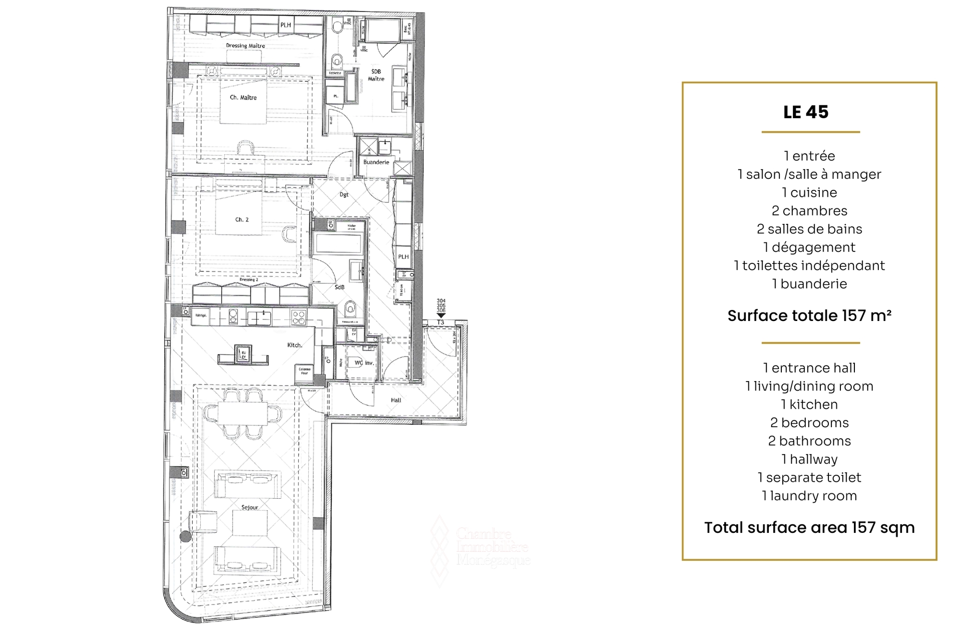 We are delighted to offer you a rare property on the market: a bright and elegant three-room corner apartment located in the luxury residence “Le 45,” a confidential address in the heart of the sought-after Condamine district.