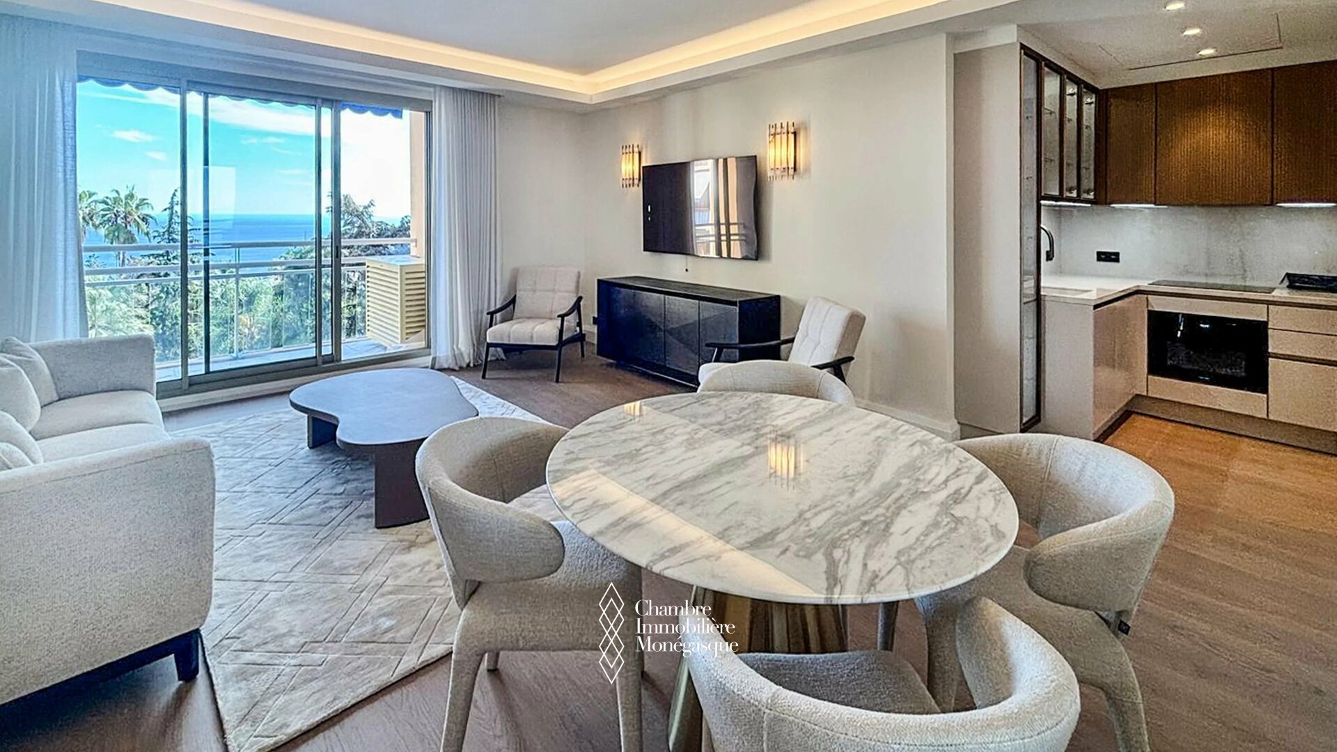 Located in the sought-after Roqueville residence, in the heart of the Carré d'Or, this elegant 3-room apartment offers a rare and sought-after living environment, just a 5-minute walk from Place du Casino. Cross-cutting, bright and fully renovated, it enjoys a privileged location in a quiet residence with landscaped gardens and concierge service, yet is within easy reach of Monaco's luxury boutiques and emblematic restaurants. The entire apartment has been renovated with noble materials and top-quality fittings. The floors are covered with solid wood parquet, bringing warmth and elegance to every room. The two shower rooms have been clad in marble, underlining the attention to detail and comfort. The bespoke kitchen, open to the living room, is fully equipped with Miele appliances, guaranteeing performance and design. Numerous built-in storage spaces have been designed to combine aesthetics and functionality. Tastefully selected furniture completes the contemporary, refined decor. This property represents a rare opportunity to acquire a turnkey residence in one of the Principality's most sought-after neighborhoods.