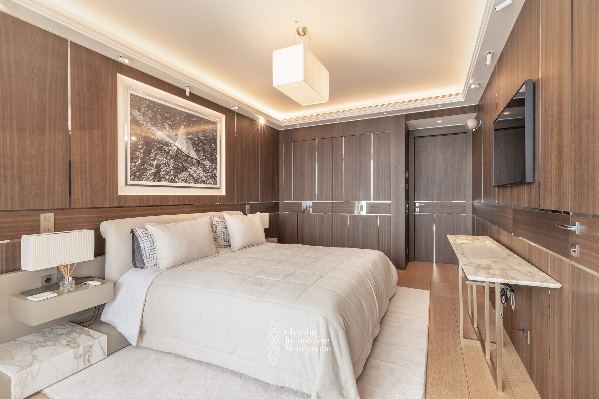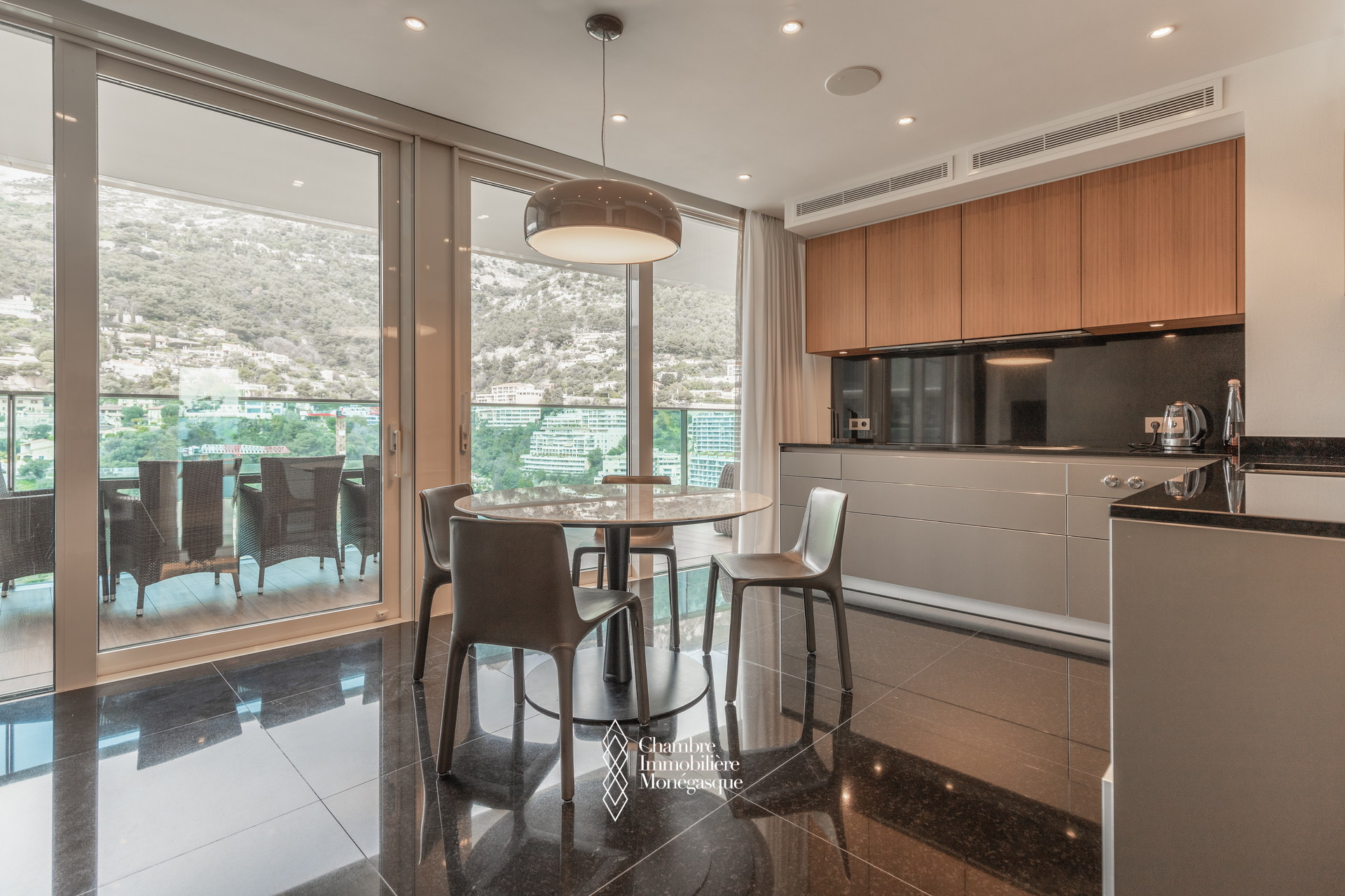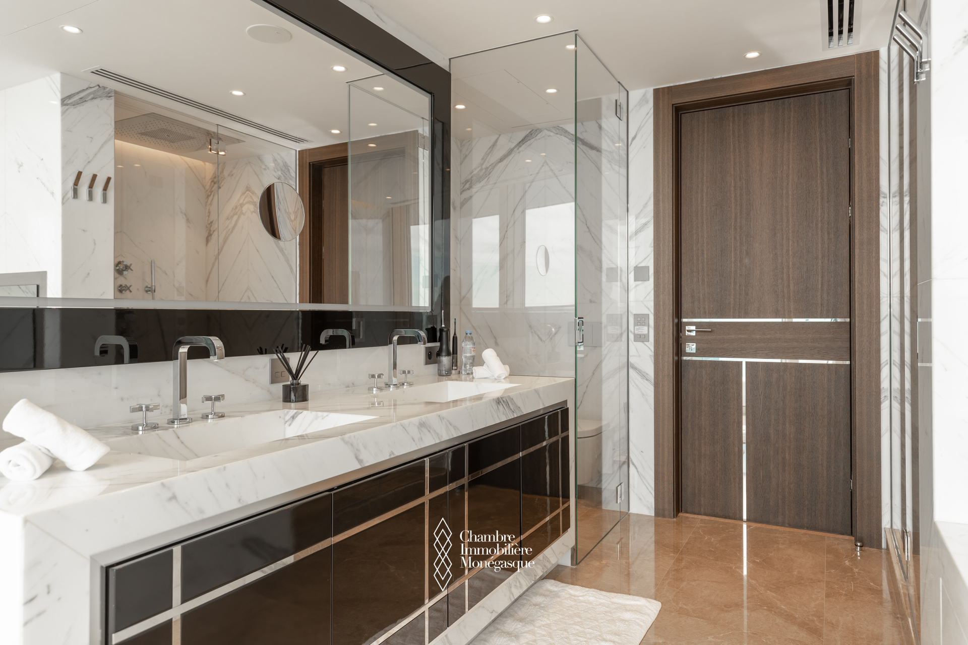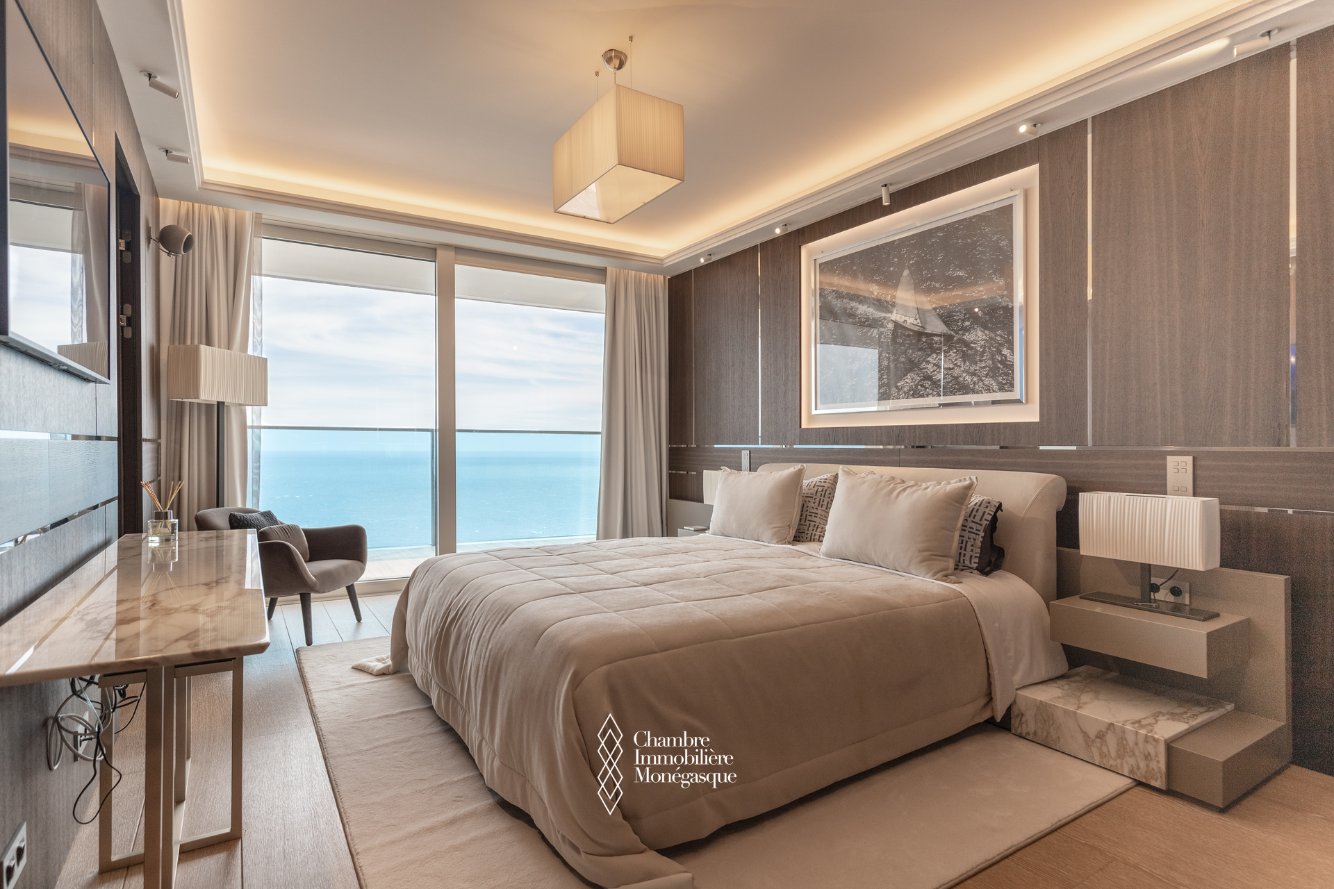The apartment comprises a majestic entrance hall opening onto a bright double living room, a fully equipped modern kitchen, four spacious bedrooms, each with their own en-suite bathrooms and dressing room. Two magnificent wrap aroun terrace offer spectacular views over the Mediterranean, the Monegasque, French & italian coasts.