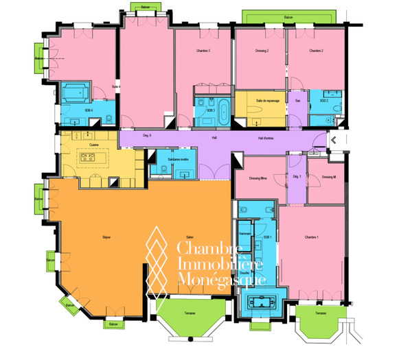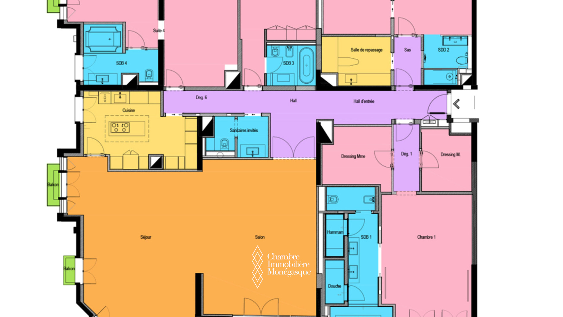 Six-seven room apartments, consisting of an entrance hall, a living/dining room, two dressing rooms, a kitchen, four bathrooms, a guest toilet, an ironing room, four bedrooms including a master bedroom offering a full sea view, as well as two suites and a fourth bedroom, . Currently being renovated. The apartment also has five parking spaces, including a box that can accommodate three vehicles, as well as a cellar / vault.