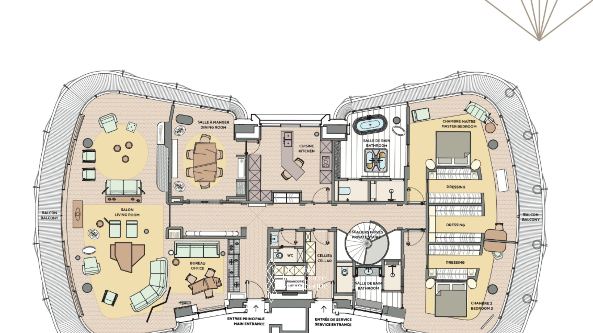 - on the 4th floor: an entrance hall opening onto a living room with a view of the Casino and the sea, a dining room, a separate fitted kitchen, 2 bedrooms with bathroom and dressing room facing the Hermitage hotel, a separate entrance for the staff with a laundry room equipped and a guest toilet.