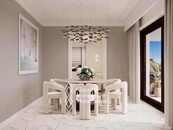 With a surface area of approximately 224 m², it consists of a large, bright living room opening onto a terrace with a spectacular panoramic view of the Casino and the sea, a fully equipped modern kitchen, as well as three spacious bedrooms with their en-suite bathrooms.