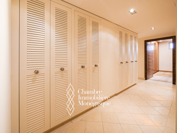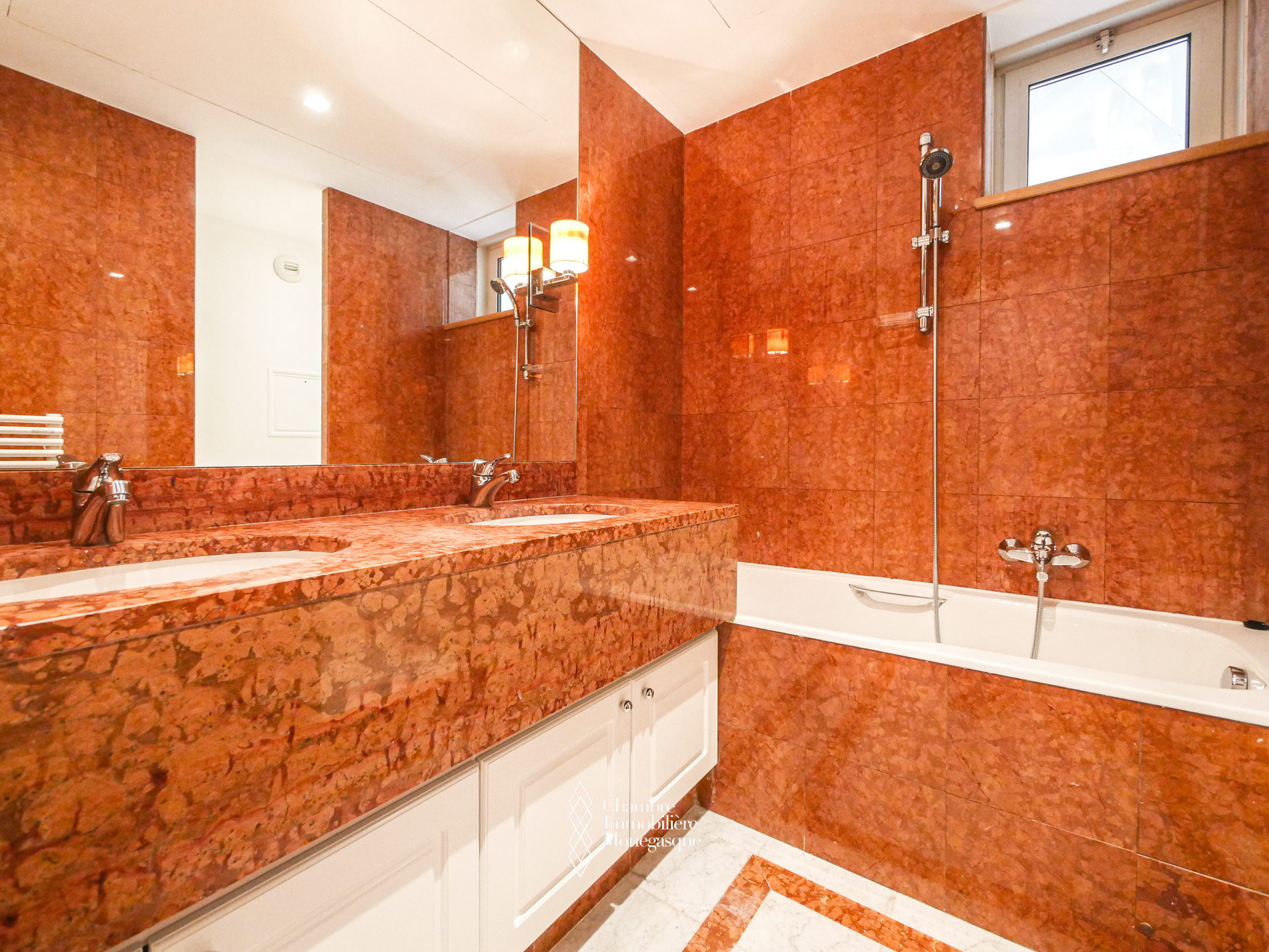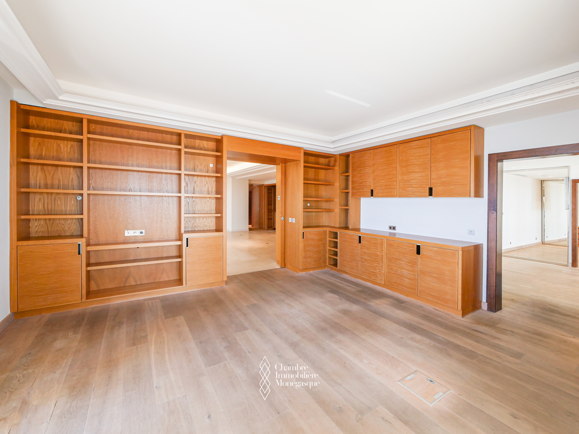 The flat consists of an entrance hall, two living rooms, a dining room with a spacious fully equipped kitchen and two offices. 4 bedrooms with dressing room and bathroom/shower, one of which has a jacuzzi. A massage room that can be transformed into a large office. Wine lovers will also appreciate the wine cellar which can accommodate 300 bottles. A laundry room and numerous cupboards add to the numerous spaces of the property.