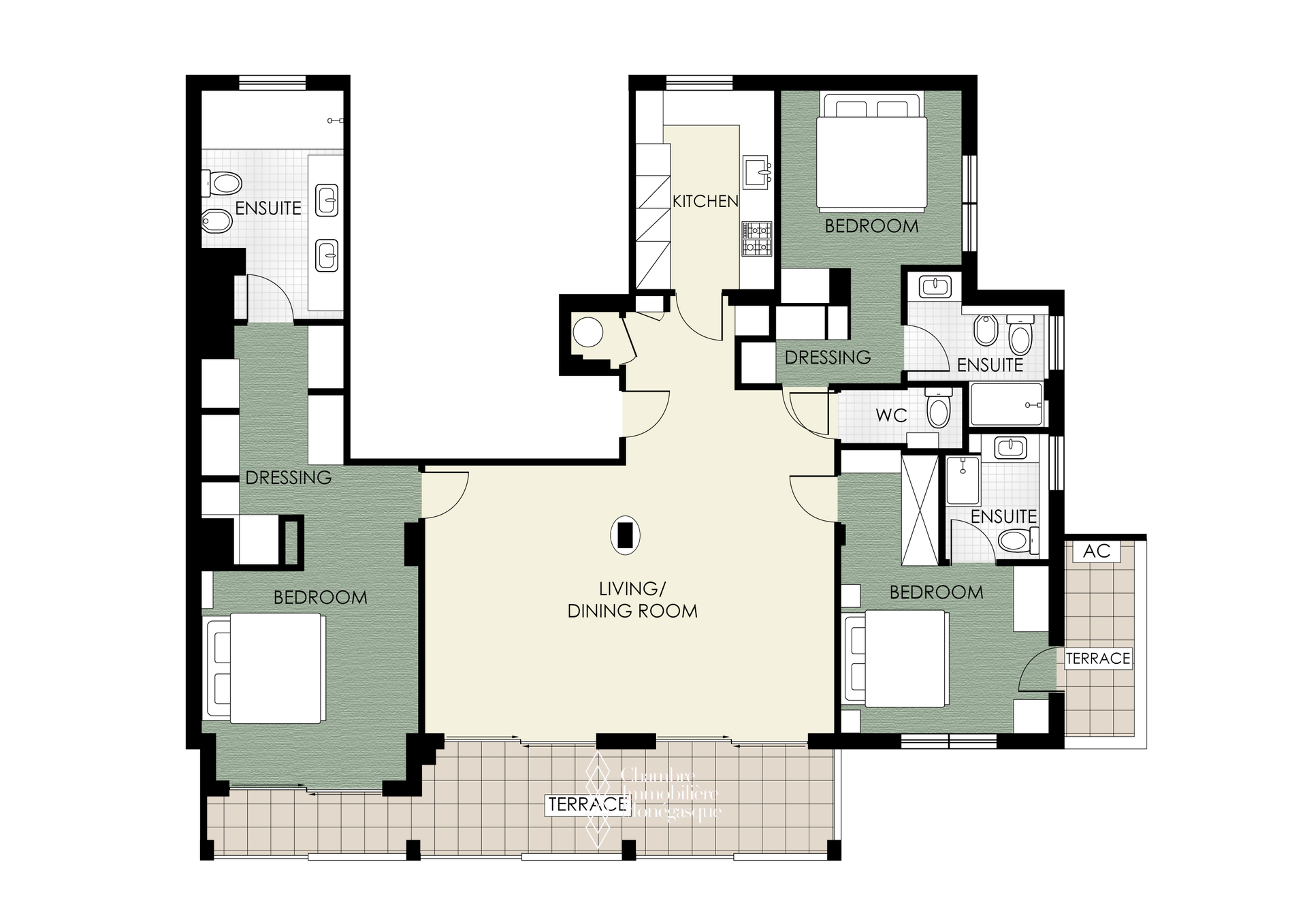 The apartment further offers two additional bedrooms, each with its own en-suite bathroom and dressing space. One of these bedrooms also enjoys access to a private terrace. A guest loo completes the apartment.