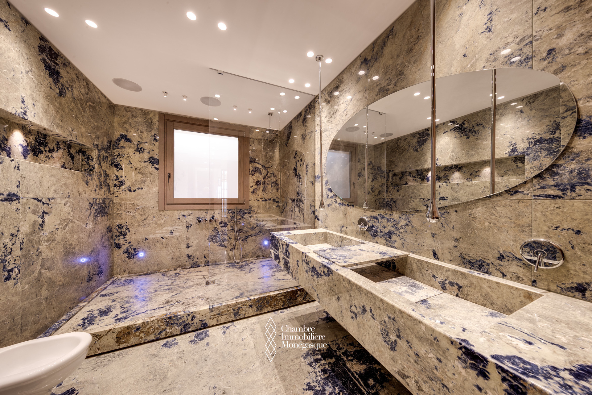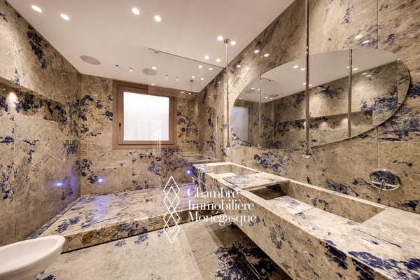 From the living area, you access the spacious master suite, where sliding glass doors lead onto the terrace and frame a picture-perfect sea view. The suite is complemented by a generous dressing area and a sumptuous en-suite finished in unique marble.
