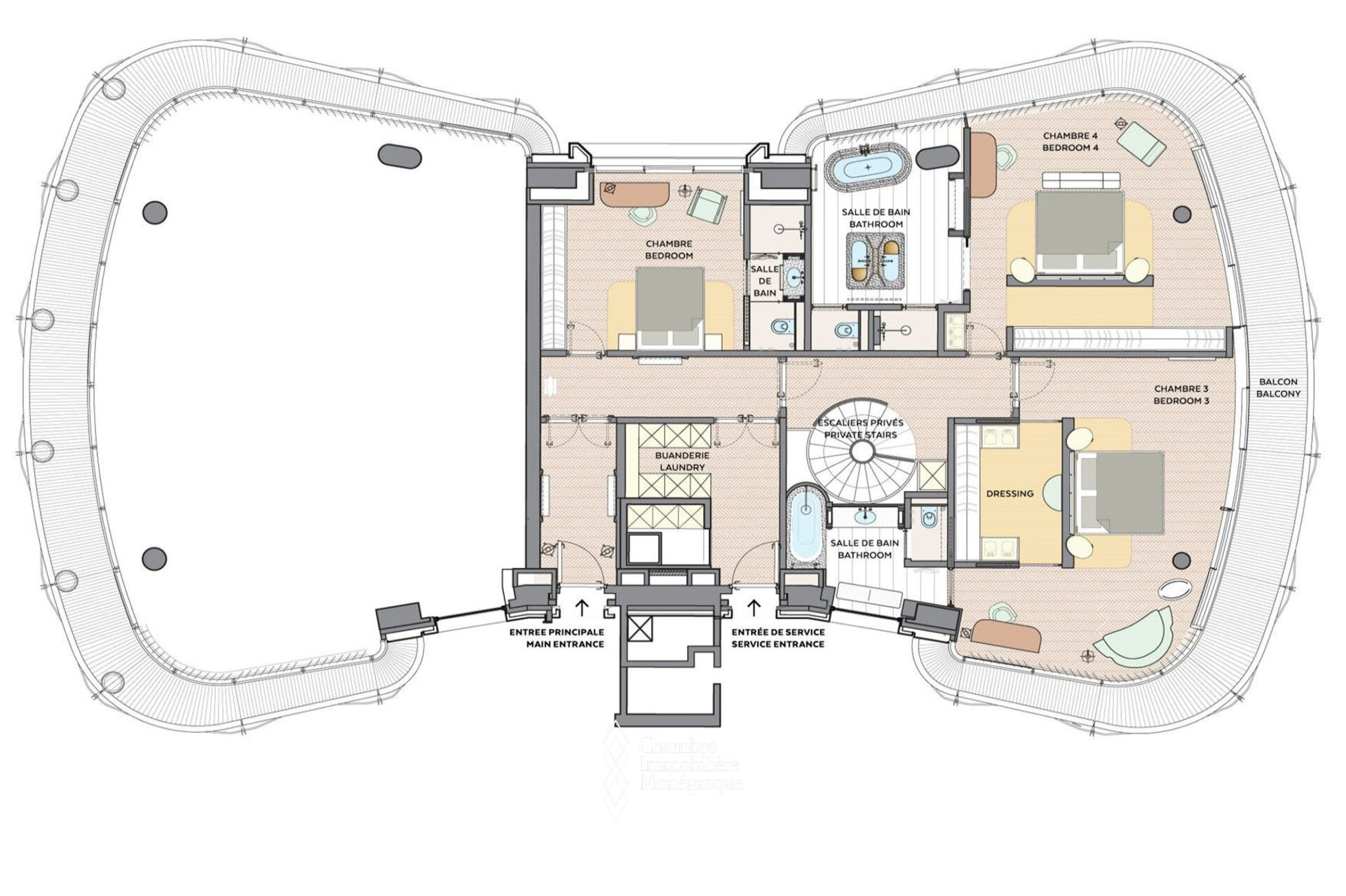 A unique 5-bedroom DUPLEX on the 4th and 5th floors of One Monte-Carlo, a state-of-the-art residence located on Place du Casino, offering high-end amenities such as **24/7 concierge and valet services**, resident access to the swimming pool and fitness center at the Hôtel de Paris or the Thermes Marins spa. One or more parking spaces available. Included in the rent: building maintenance fees, concierge and valet service 24/7, water, electricity, heating, air conditioning. At an additional cost: room service, housekeeping (cleaning, laundry), TV/internet/telephone subscriptions?
