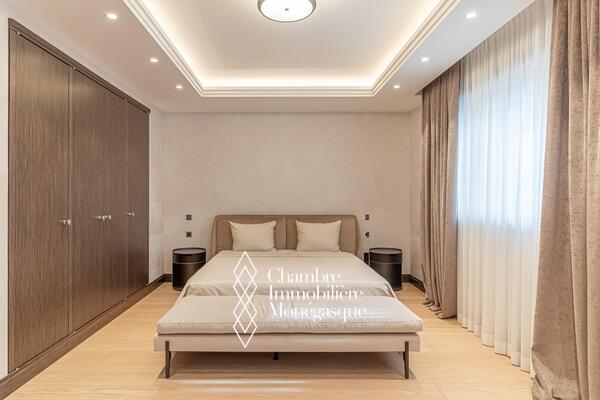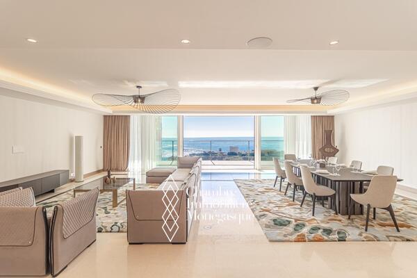 This exceptional family apartment, benefiting from sunshine and beautiful sea view, elegant marble and precious woodwork, offers a large entrance, double living room and dining room, high-end kitchen and laundry room, one master bedroom with bathroom and dressing room ensuite, four bedrooms (one of which can be used as a study) with their own bathroom, and a spacious terrace.