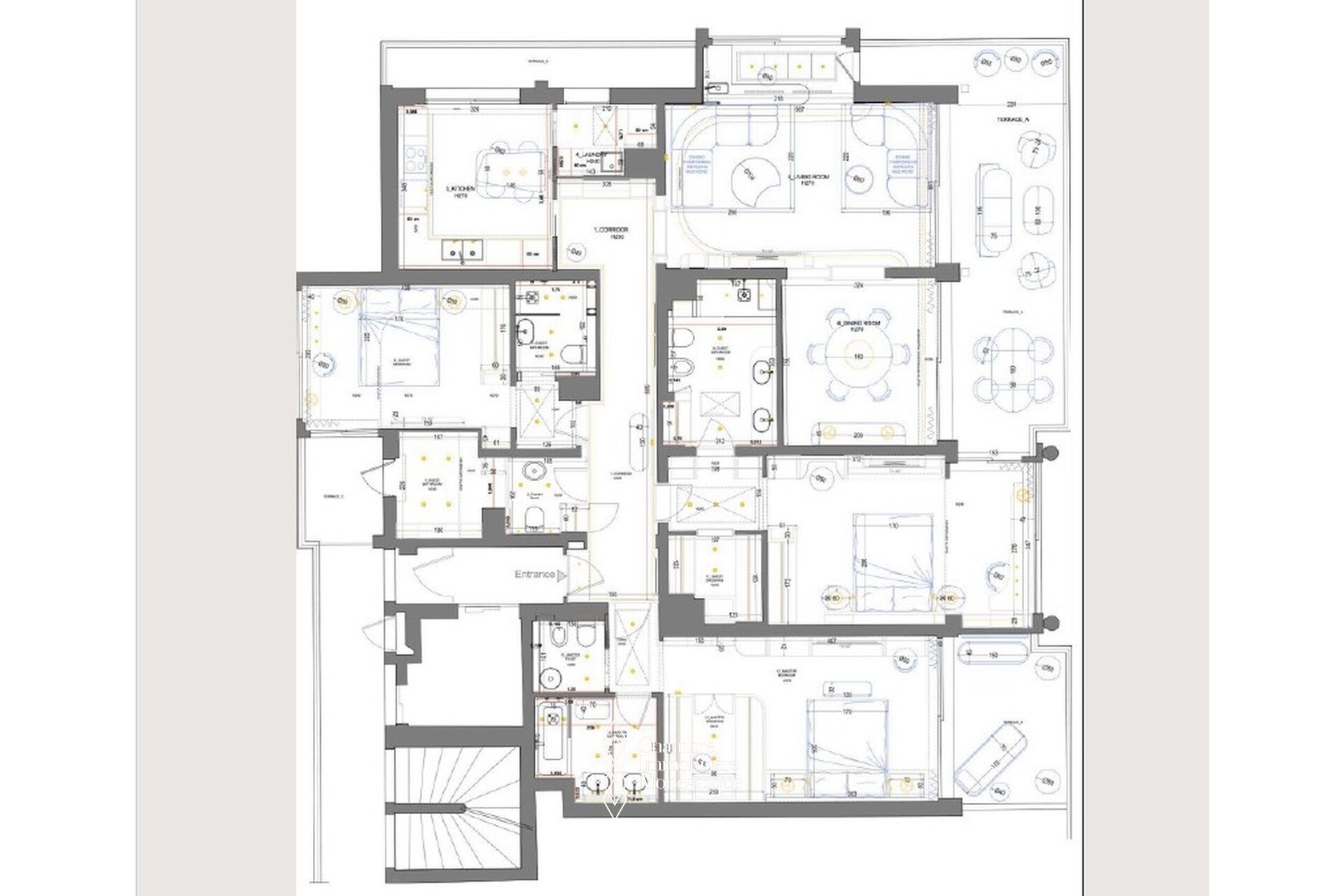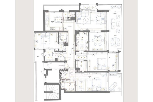 The apartment includes a large bright reception area, three bedrooms, each with its own bathroom, as well as a guest toilet. The property also includes a fully fitted kitchen with independent laundry room. The wide openings extend the living spaces towards the terrace, offering panoramic views of the sea and the Casino.