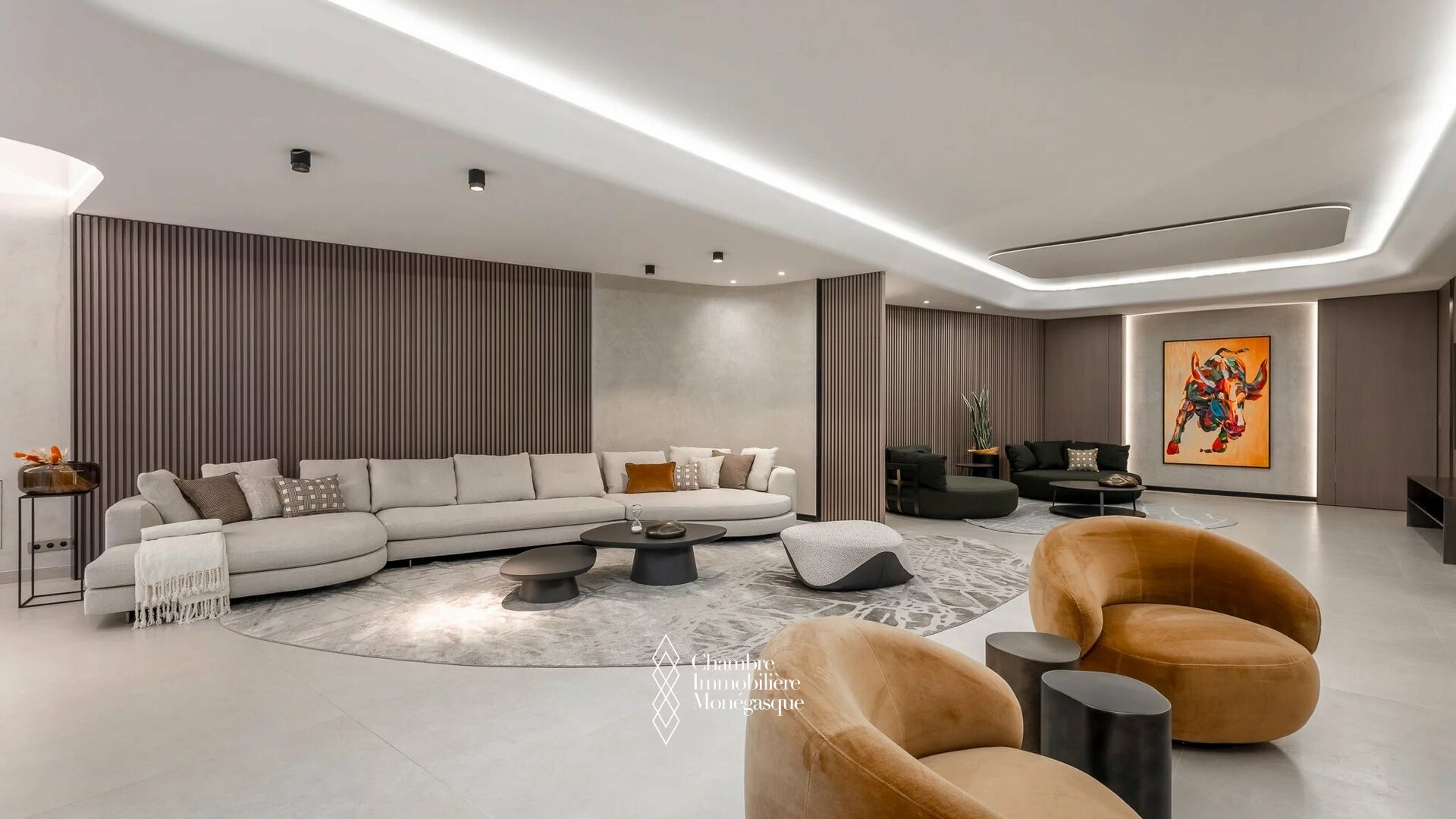 First floor: a dreamy 300 m² triple living room, a modern open kitchen, a dining room and relaxation area with fireplace, a large TV room and a fitness room.