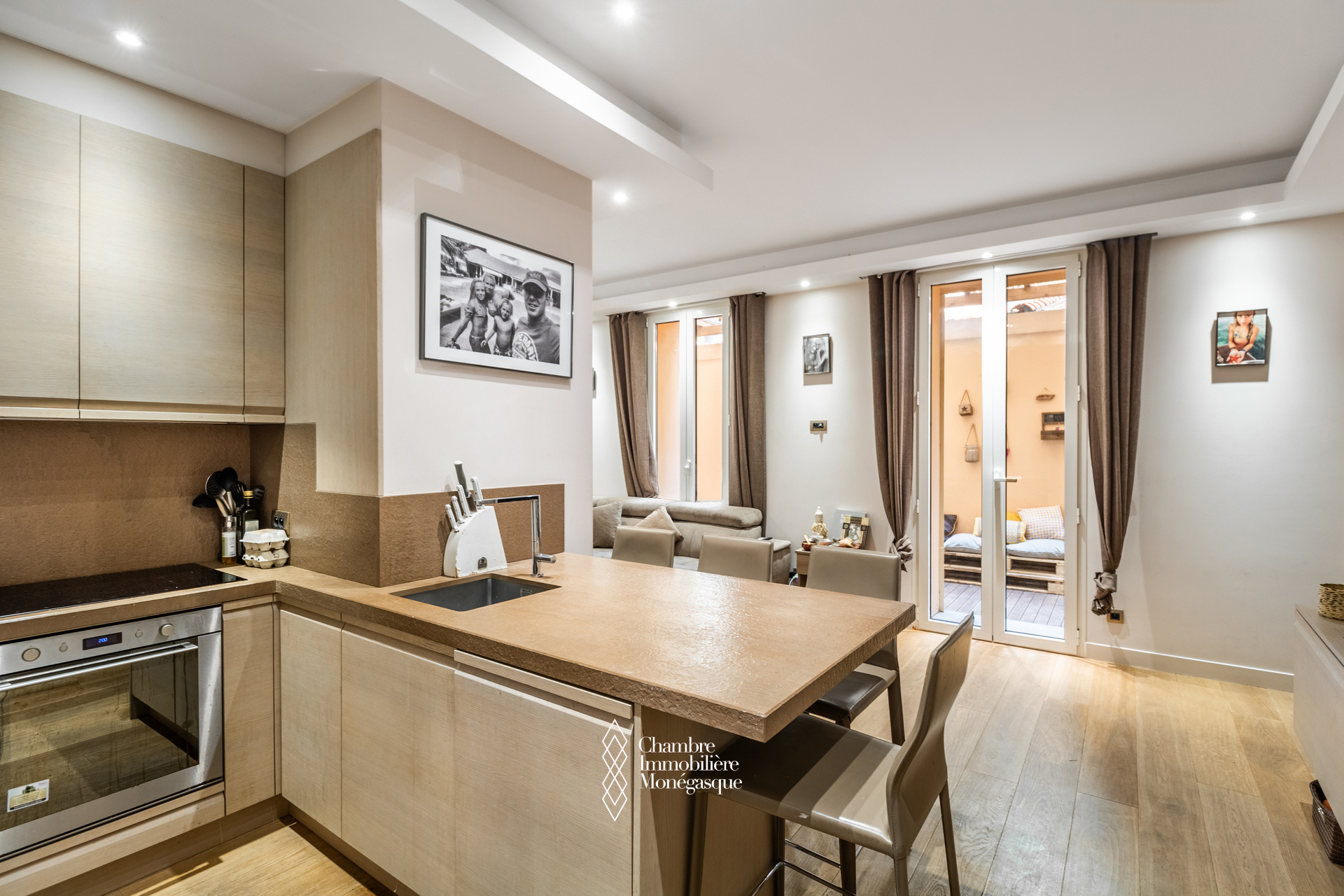 - living room with open plan kitchen, opening on to a terrace
