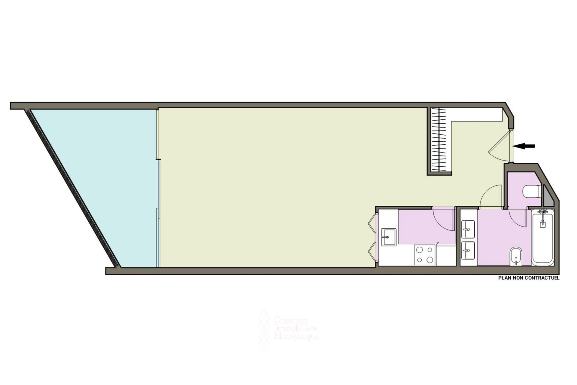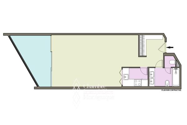 With a surface area of 54 m², including a 12 m² terrace, the apartment is composed as follows: an entrance hall with closets, a bathroom, a fully equipped kitchen and a spacious main room that opens onto a large terrace.