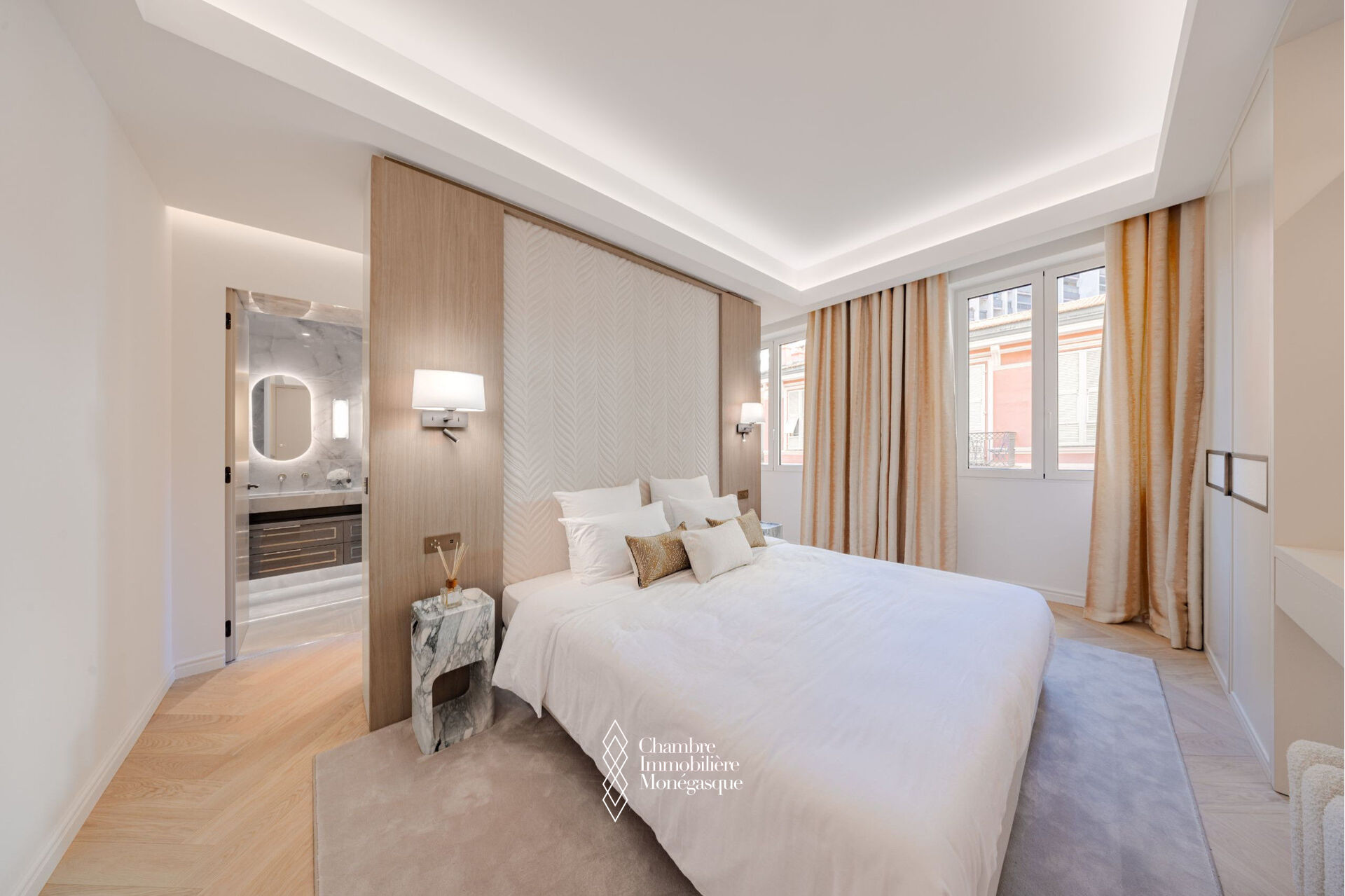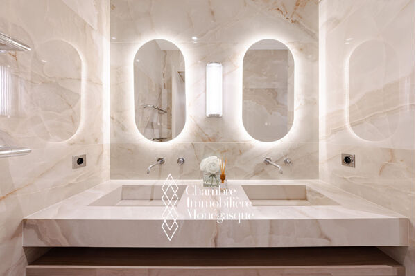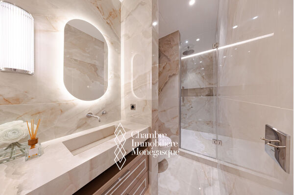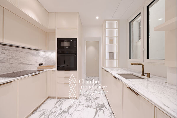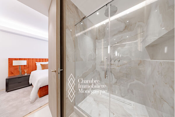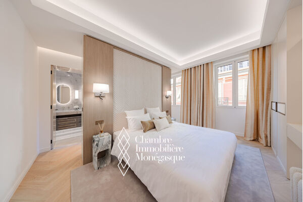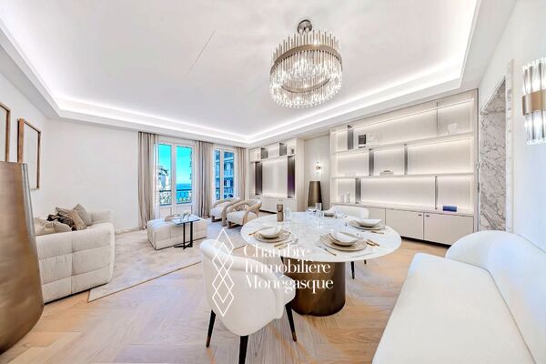 EXCLUSIVE In the heart of the Golden Square, this stunning three-room apartment has been fully renovated with high-end finishes. It consists of two bedrooms, each with its own ensuite shower room, as well as a guest toilet. Additionally, a fully equipped and fitted separate kitchen completes the apartment, along with a bright living/dining room that opens onto a balcony overlooking the Golden Square with a sea view. The apartment also includes a cellar.