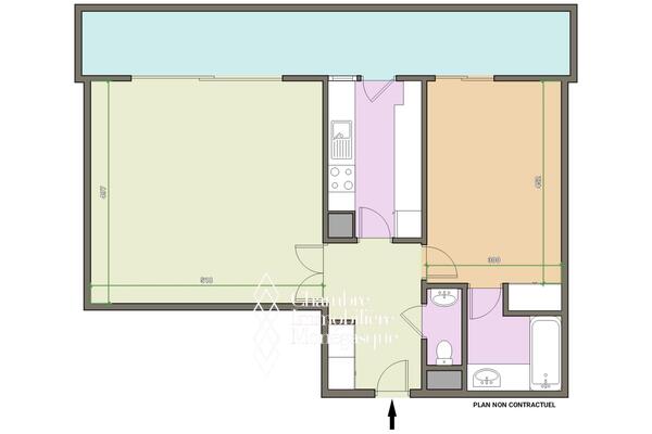 Bright and spacious, it comprises an entrance hall with built-in cupboards, a guest toilet, a large living room opening onto the terrace, a separate fitted kitchen and a bedroom with an en-suite bathroom.