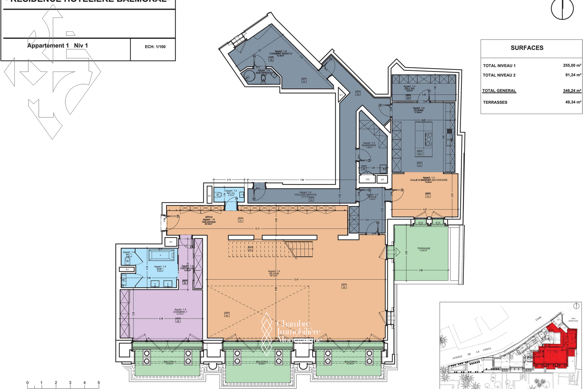 1er niveau : Entrée, Séjour, Salon, Salle à manger, Cuisine, Economat, Buanderie, Bureau, 1 Chambre avec Salle de bains et WC, Dressing, 1 Chambre de service avec Salles de bains et WC, 1 Terrasse et 3 Balcons.