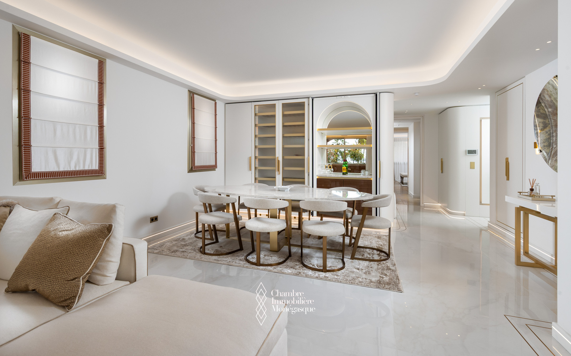 Dès l’entrée, le hall mène à des espaces de réception d’exception, comprenant un salon sophistiqué, une salle à manger avec bar intégré, et une cuisine ouverte haut de gamme, le tout sublimé par une vue imprenable sur le port et ses prestigieux yachts.