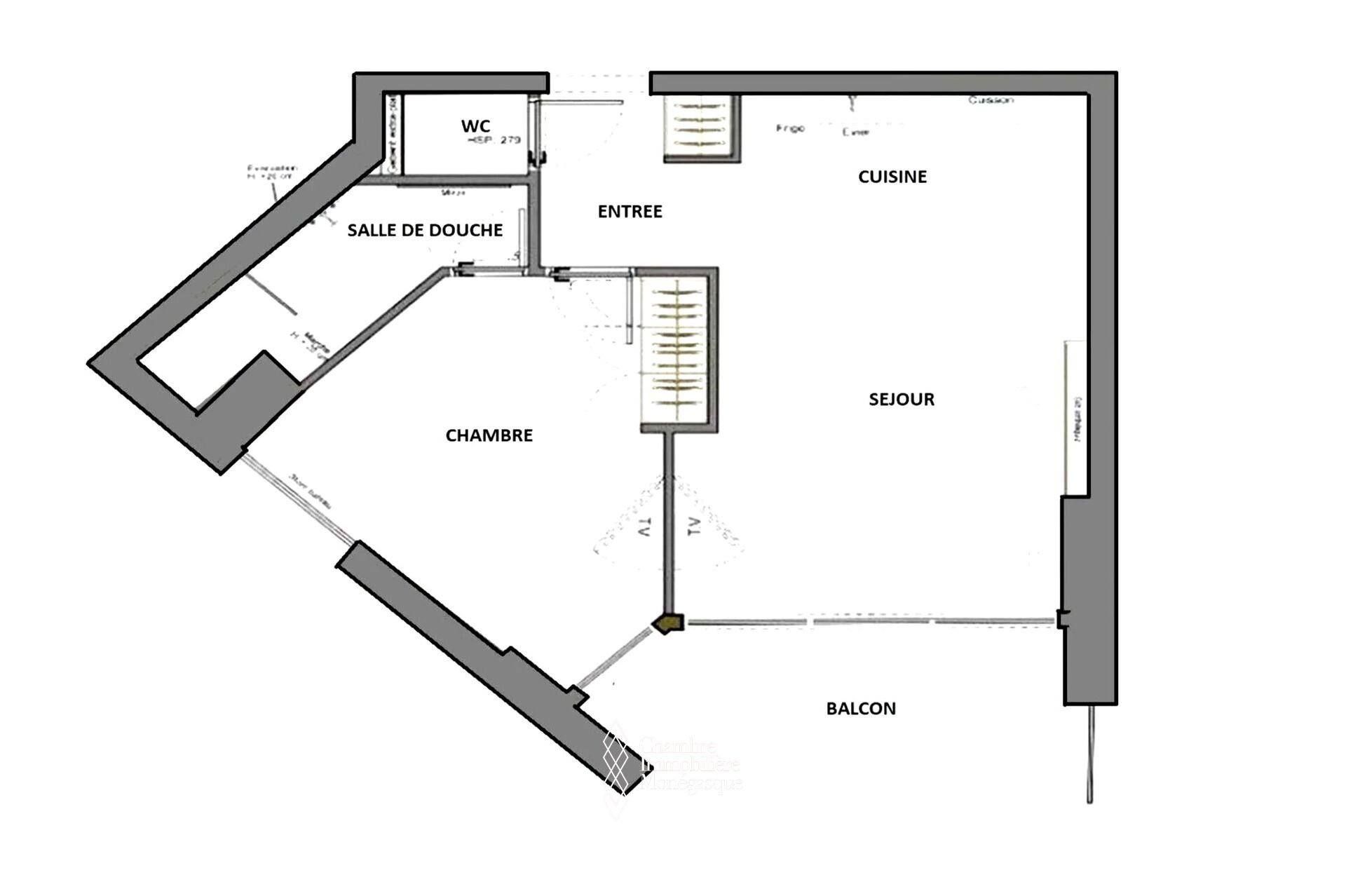 L'appartement est composé comme suit : Entrée, salle à manger avec cuisine américaine, un séjour en suite ouvrant sur le balcon vue sur la mer et la Principauté, une chambre, une salle de douche. Une cave. Possibilité parking en supplément, 300.000 €