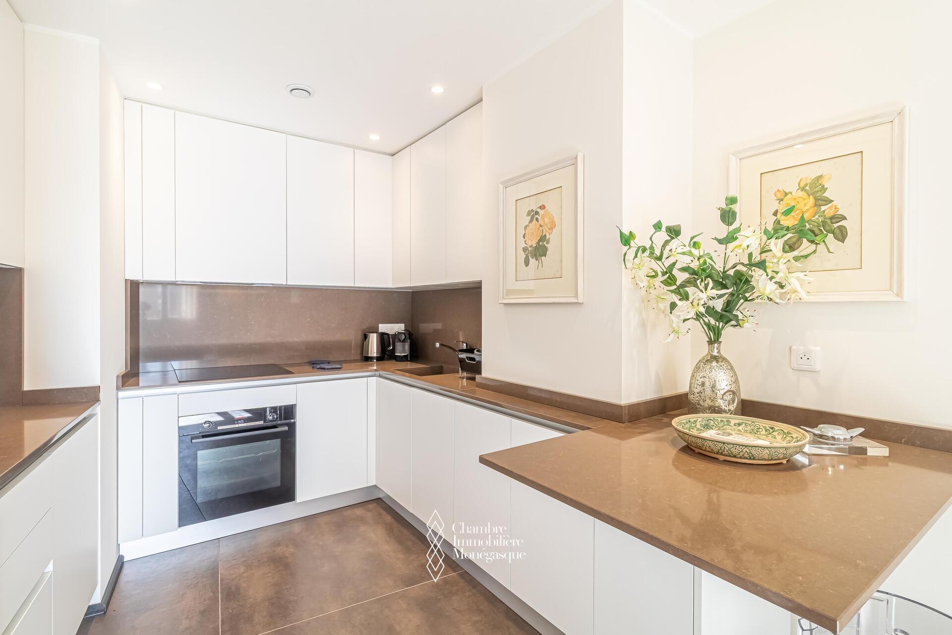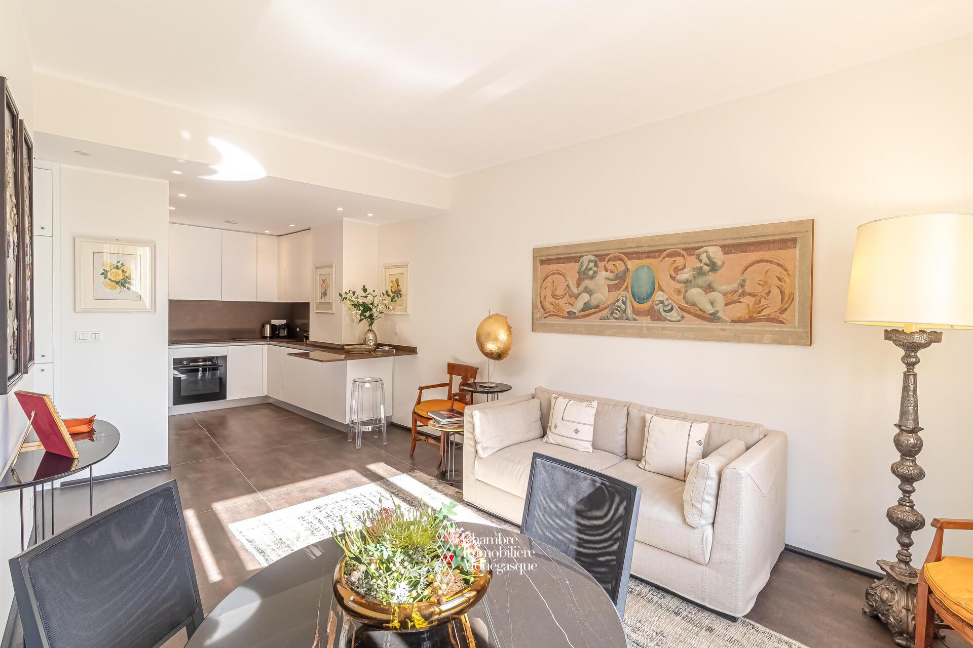 Au sein d'une résidence de bon standing avec un service de conciergerie, proche du boulevard des Moulins et de la plage du Larvotto (accessible par un ascenseur public), ce beau 2 pièces entièrement rénové est parfait pour un pied à terre.
