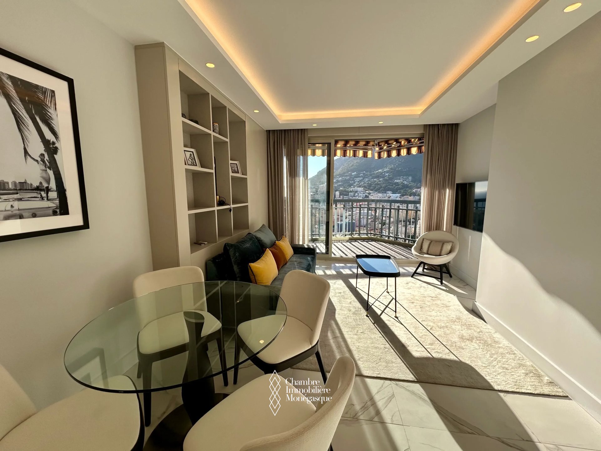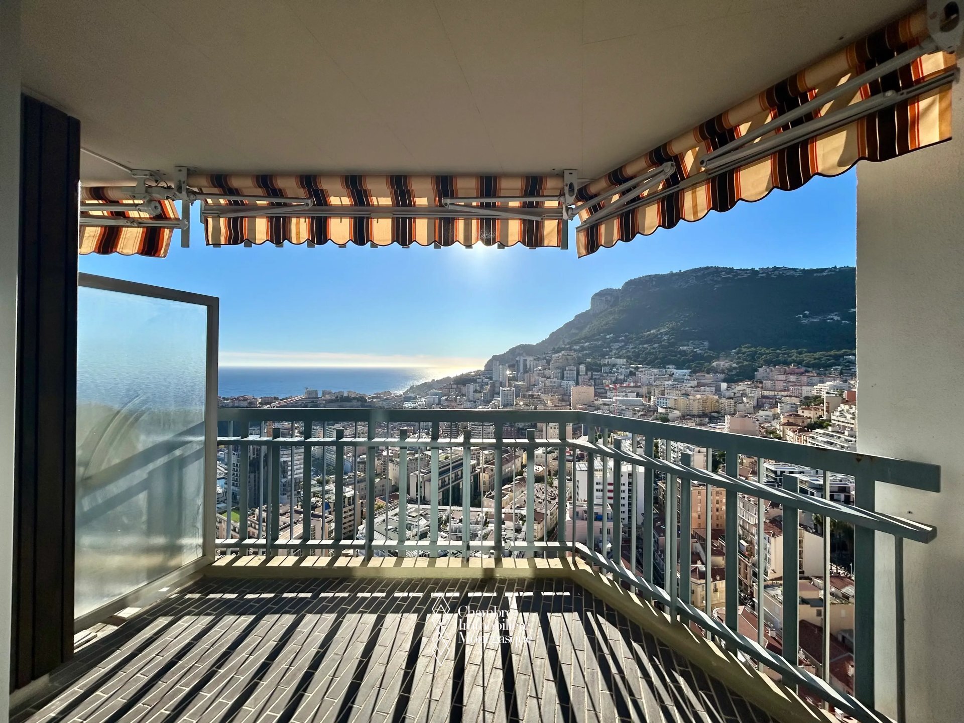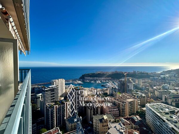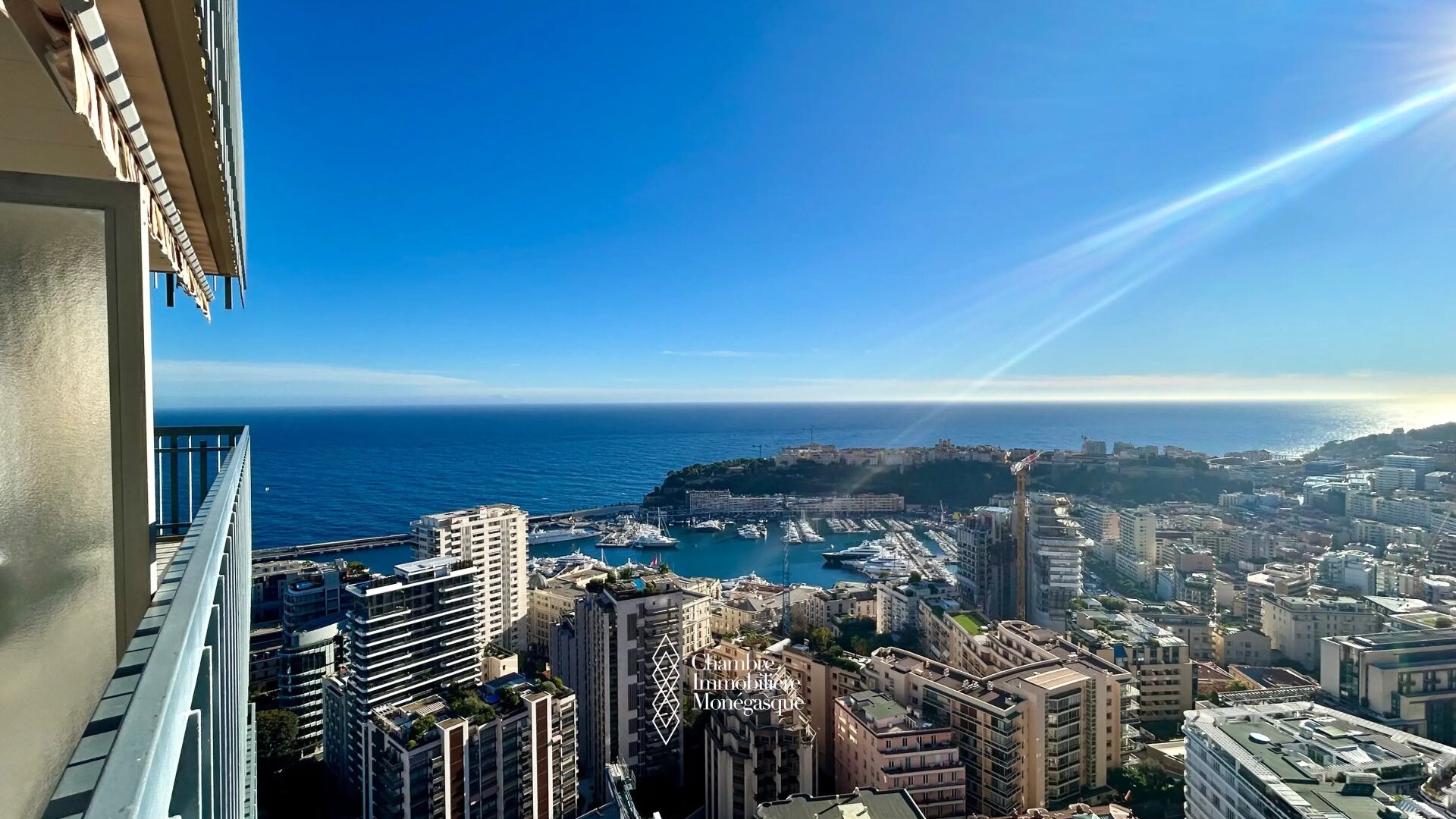 Situé au 27ème étage, cet appartement rénové avec des prestations haut de gamme bénéficie d’une vue panoramique sur la mer, le port et le Rocher offrant un cadre de vie luxueux.