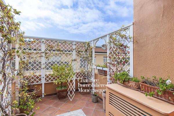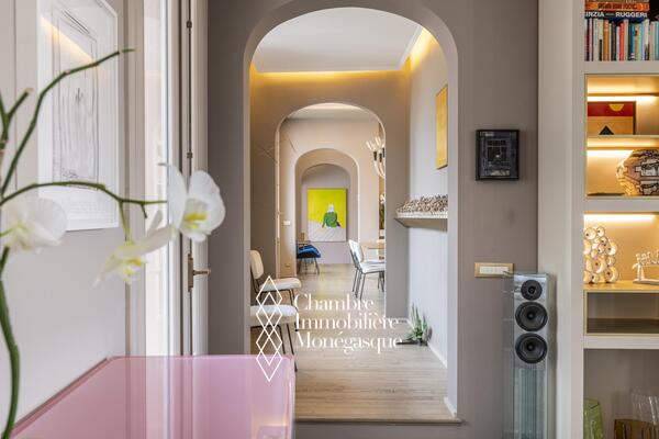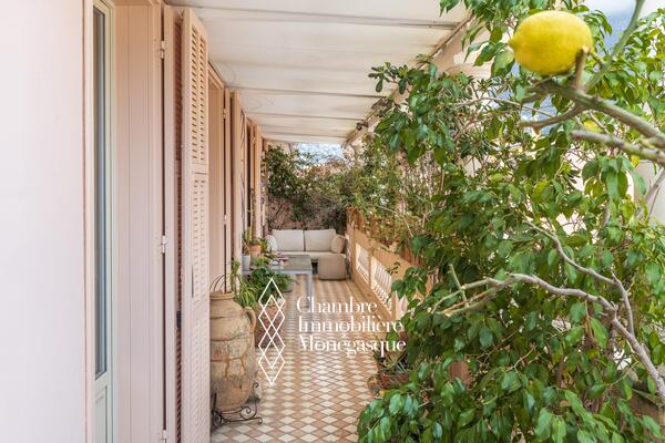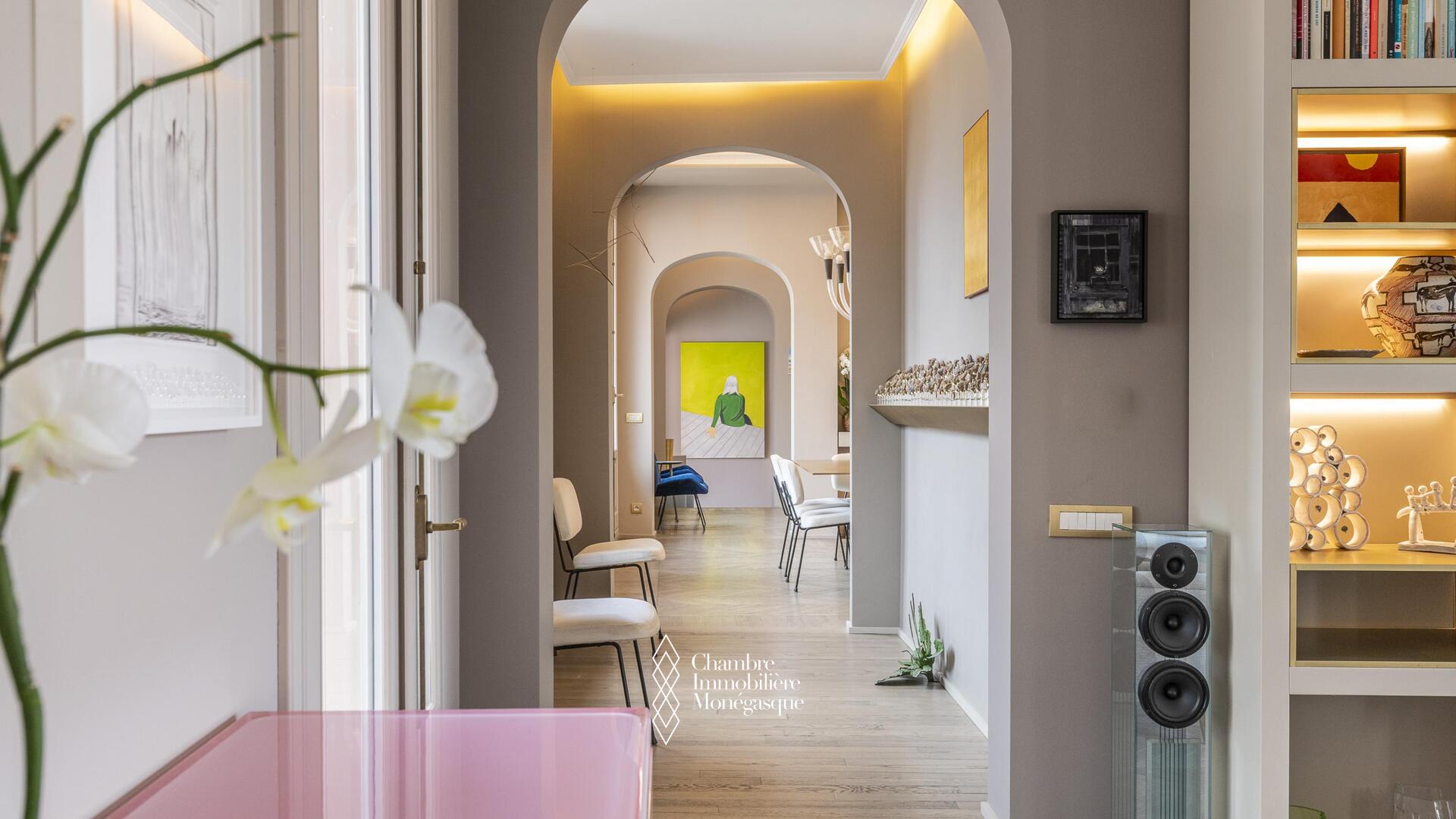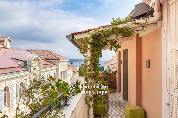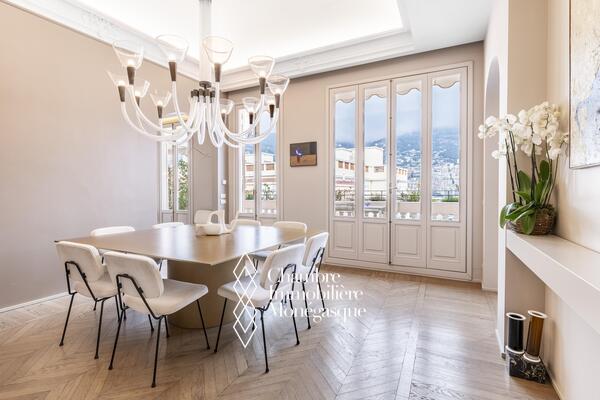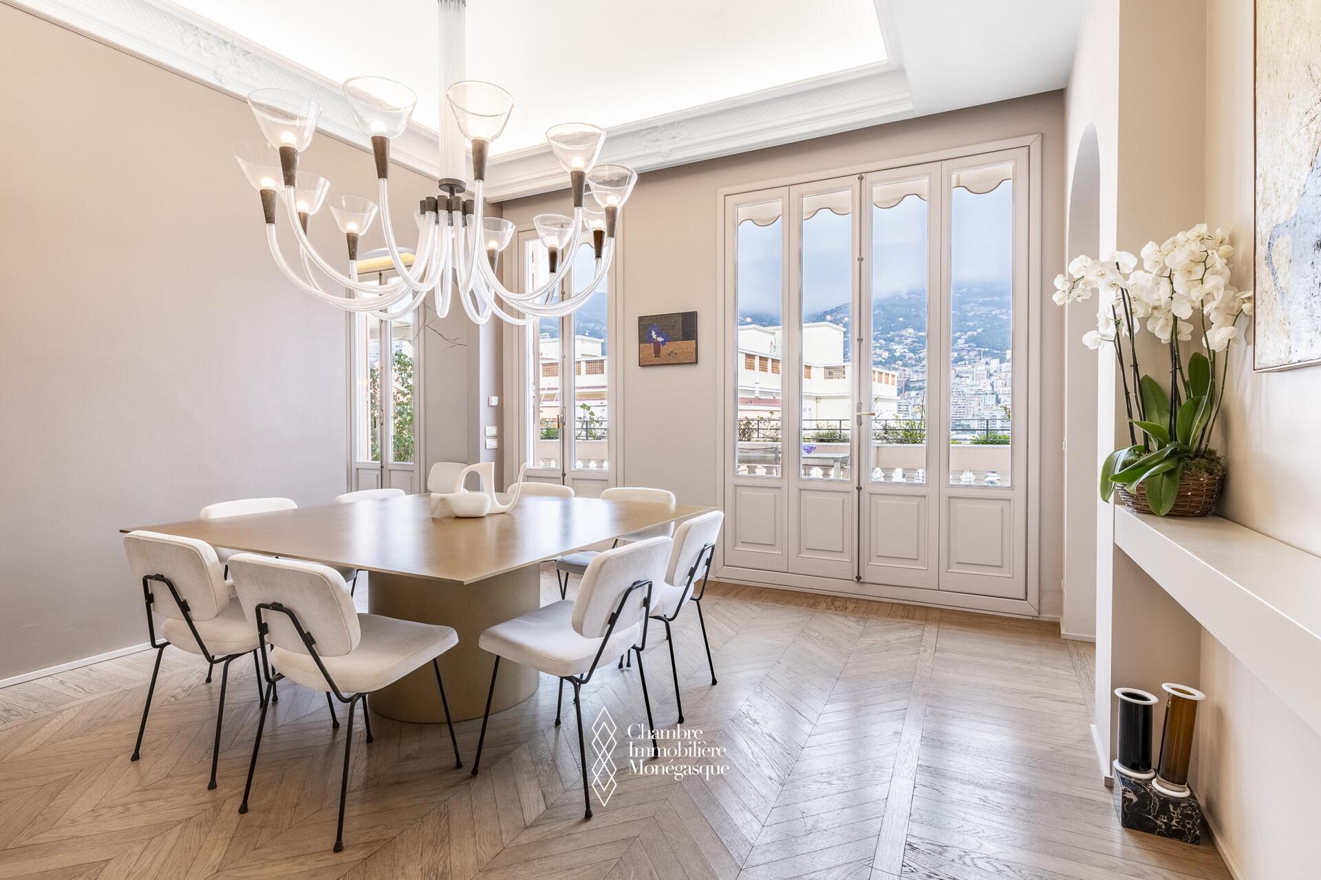 Dés l'entrée, le vaste séjour traversant baigné de lumière avec ses grandes portes-fenêtres offre une belle hauteur sous plafond, le tout s’ouvrant sur une terrasse ensoleillée au charme méditerranéen, parfaite pour des instants de détente face aux toits de Monaco ou à la mer.