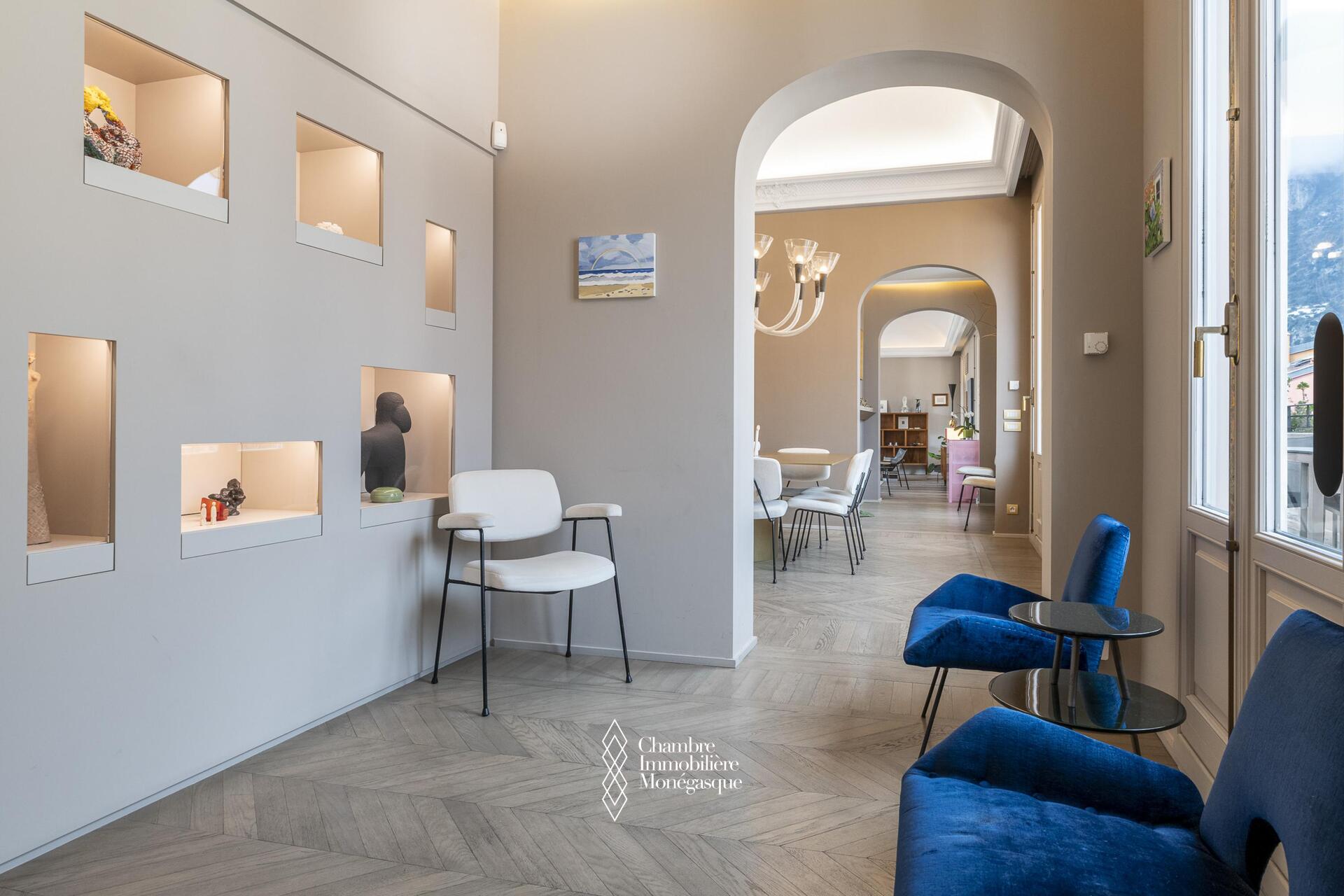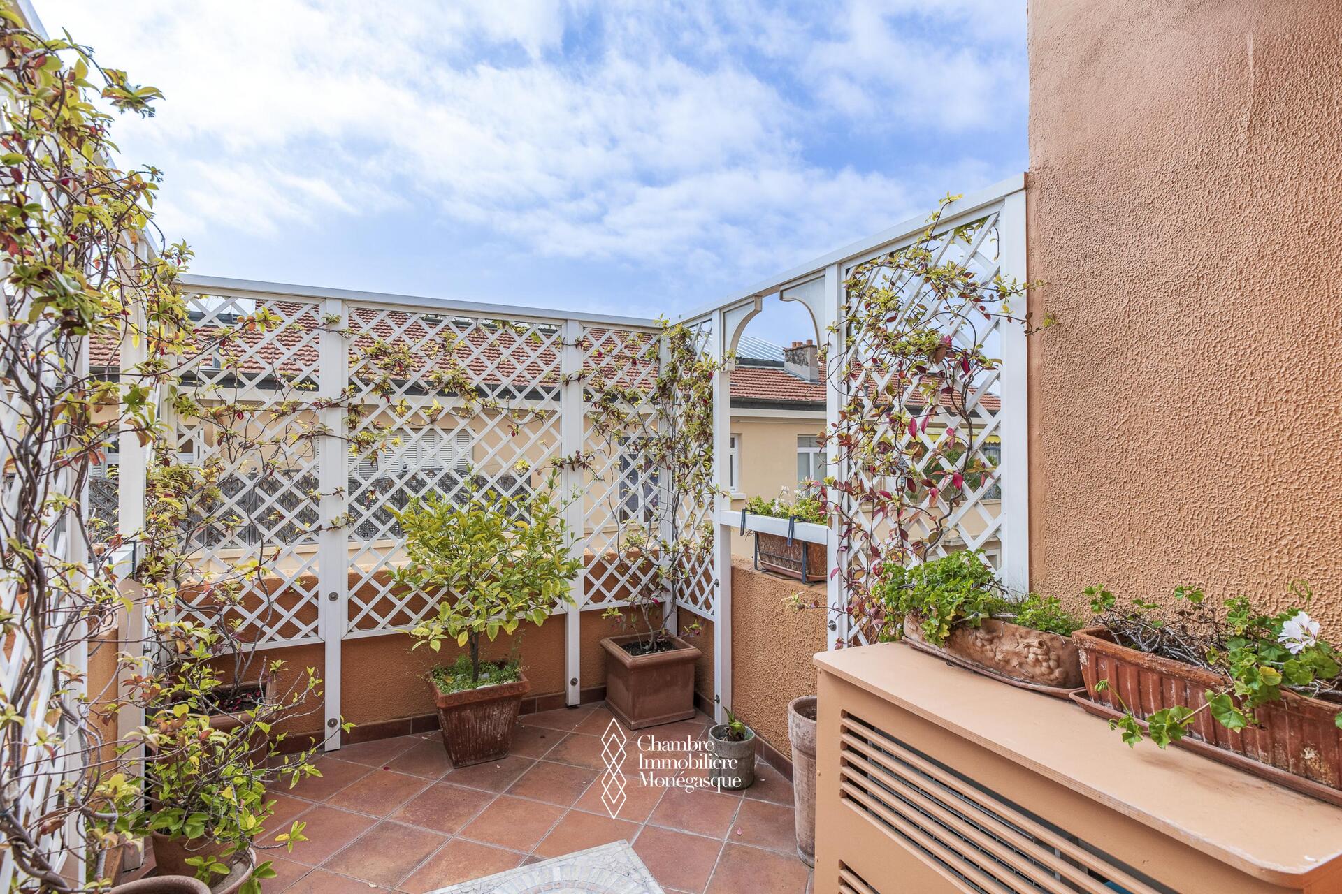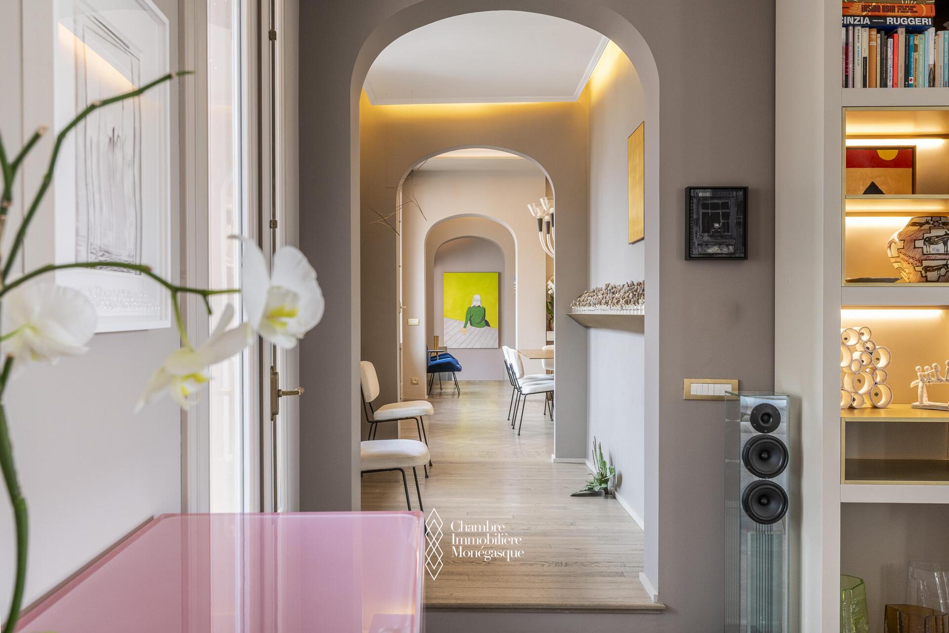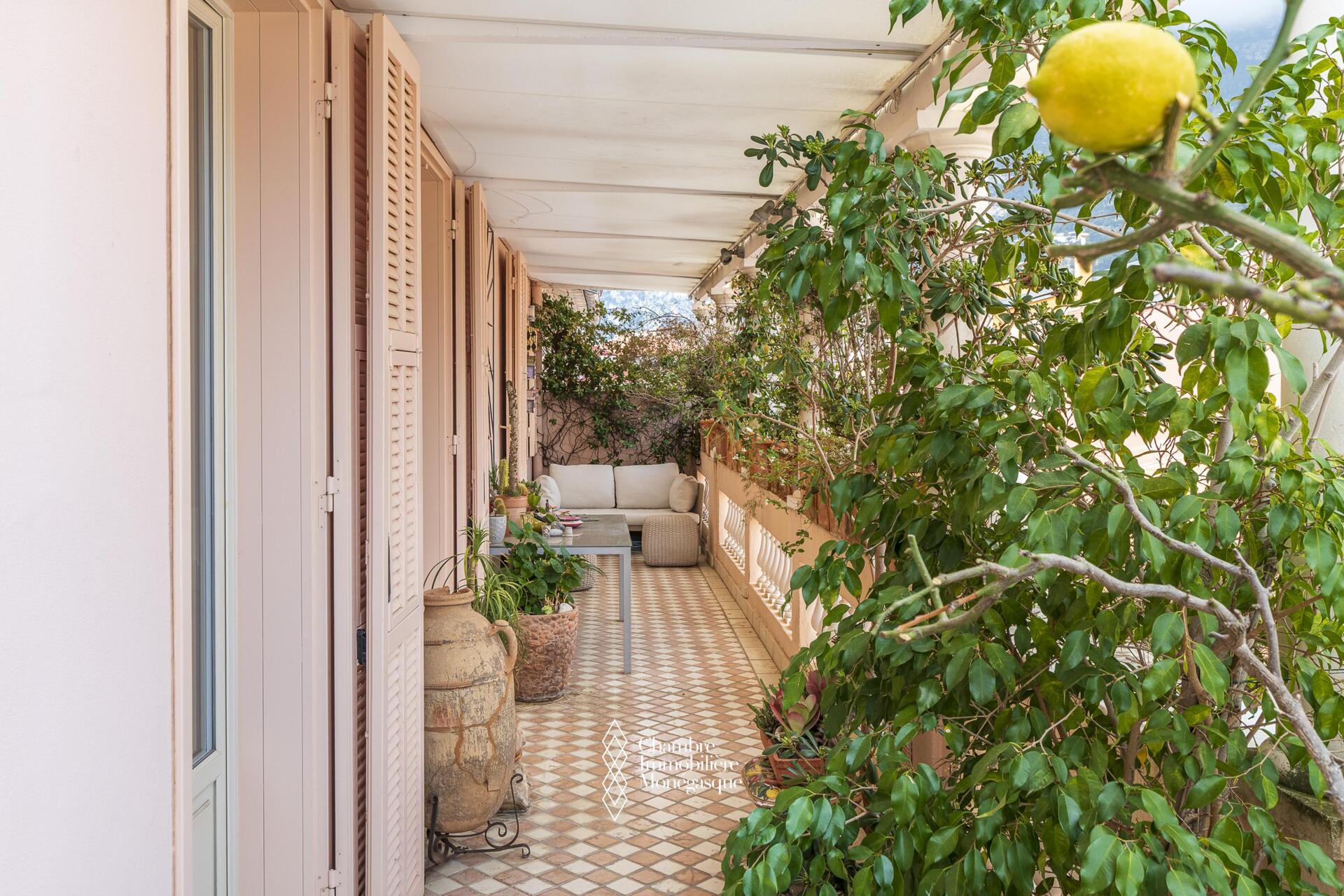 Dés l'entrée, le vaste séjour traversant baigné de lumière avec ses grandes portes-fenêtres offre une belle hauteur sous plafond, le tout s’ouvrant sur une terrasse ensoleillée au charme méditerranéen, parfaite pour des instants de détente face aux toits de Monaco ou à la mer.