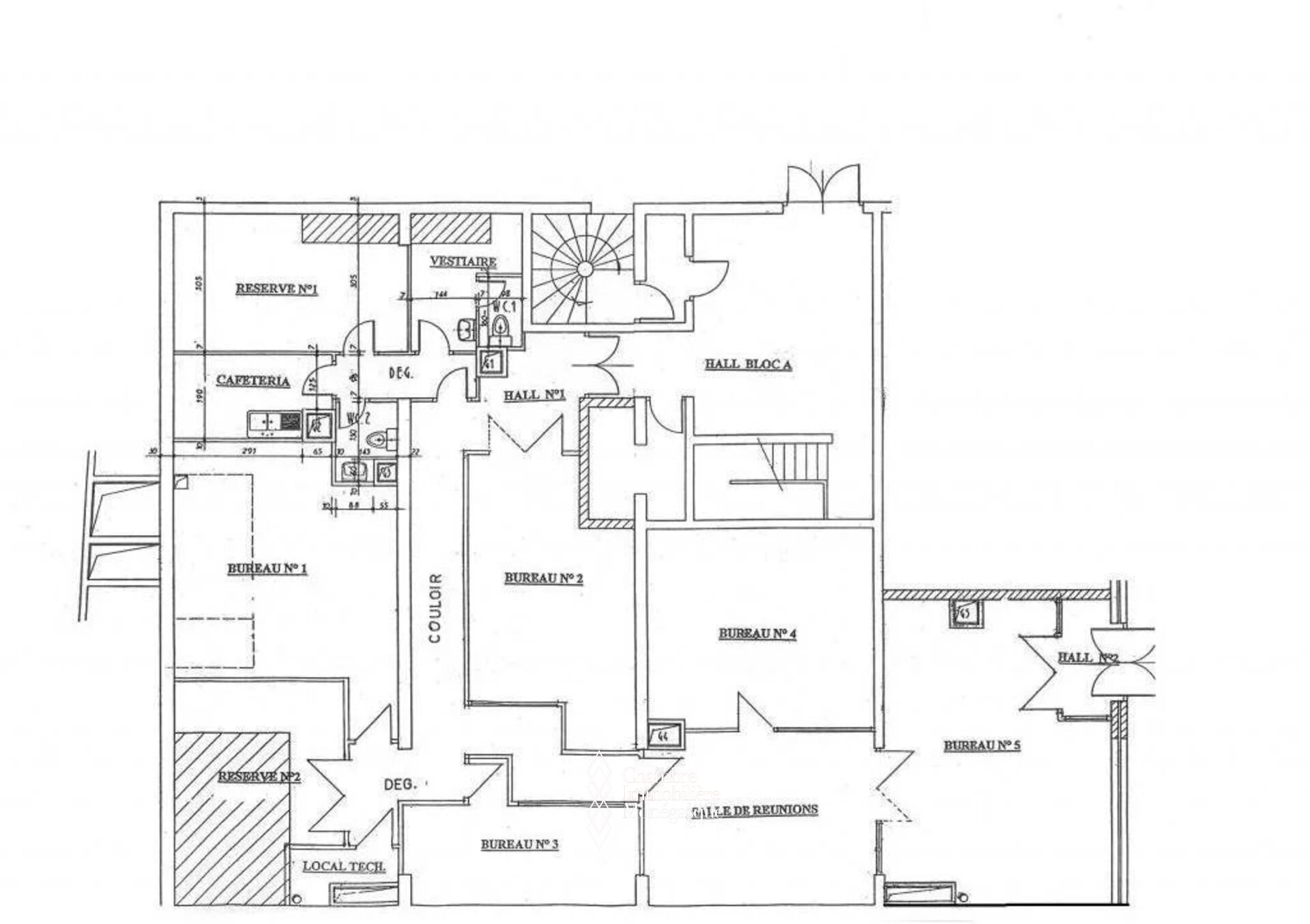 actuellement organisé en bureaux avec réception, 5 bureaux spacieux, salle de réunion, grande réserve, petite cuisine, sanitaires hommes et femmes, vestiaires et local technique,