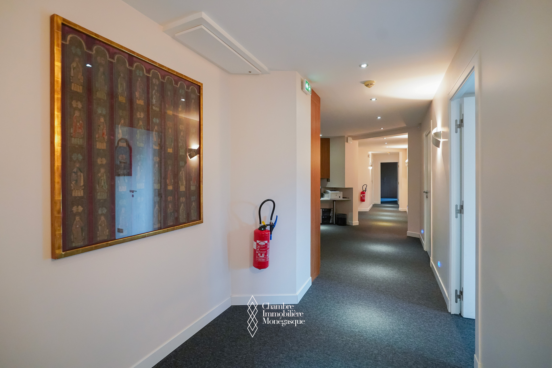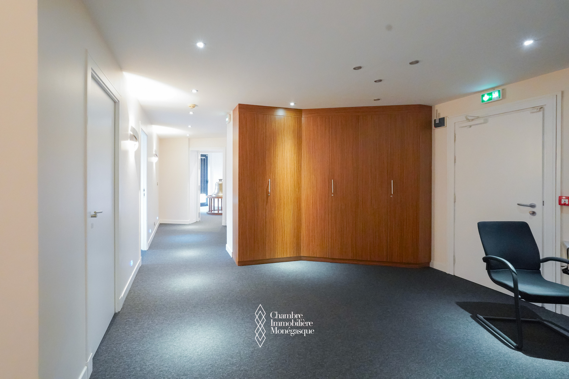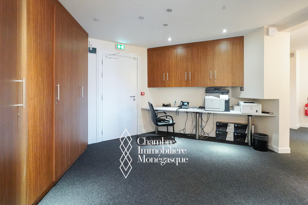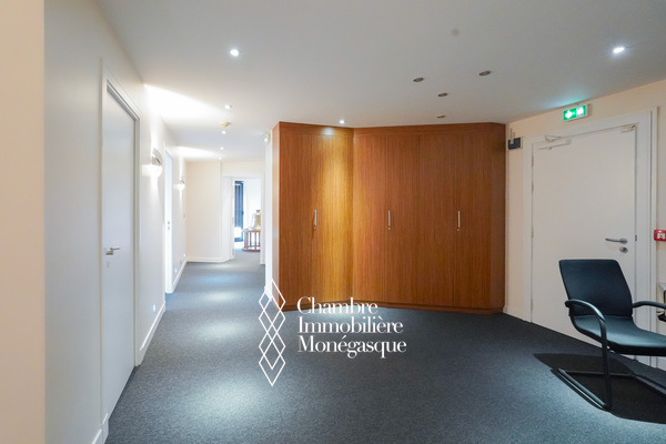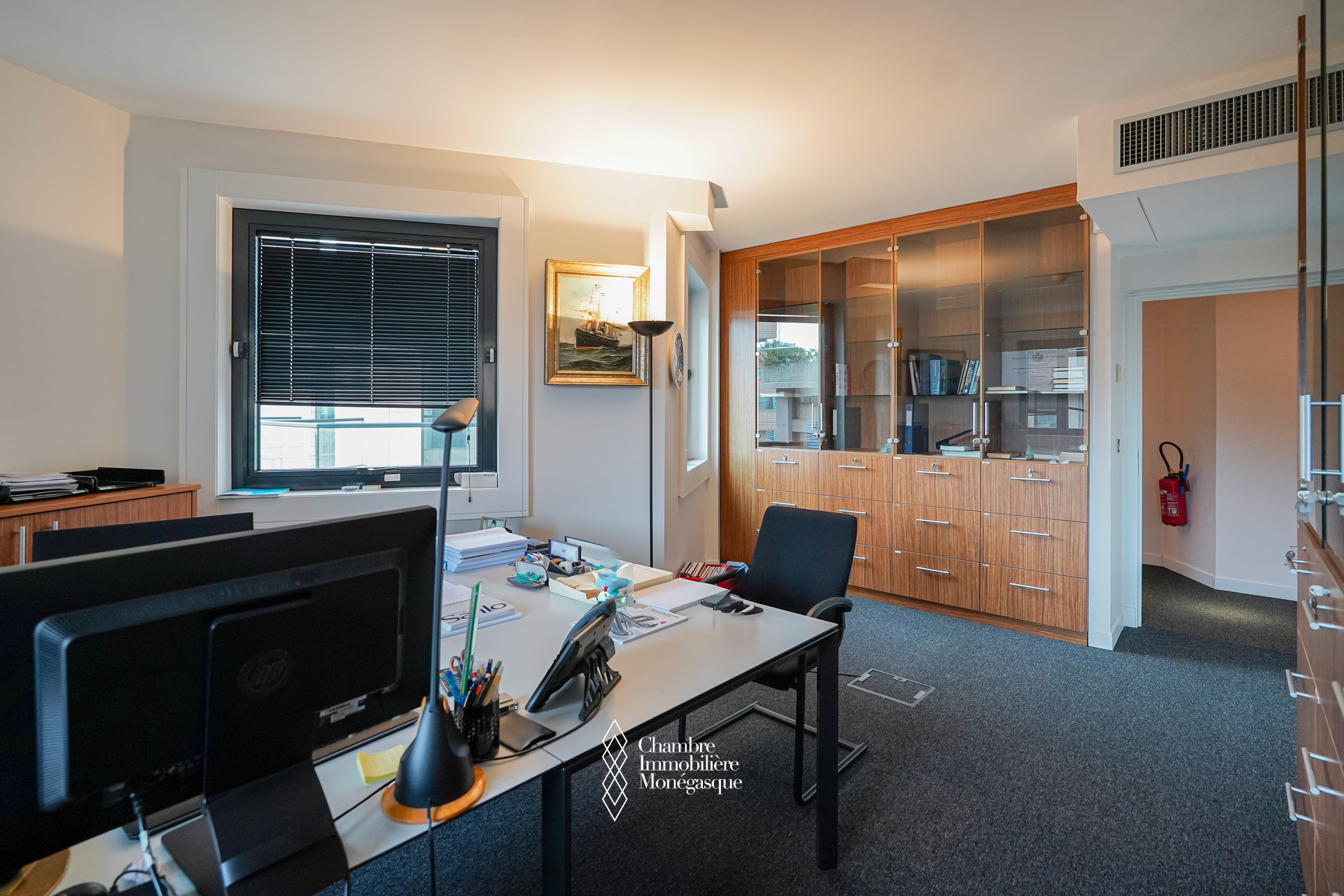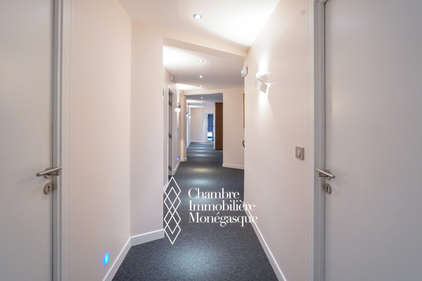 Grand espace de bureaux d'une superficie totale de 200m2. Il se compose d'un entrée avec espace d'accueil, de 5 bureaux indépendants donnant sur l'avenue des Citronniers, dont deux avec leur terrasse. L'une d'entre elle offrant une petite échappée sur le circuit de Formule 1. Un espace de stockage ou archives et des sanitaires. Les bureaux seront entièrement vidés (hors placards intégrés).