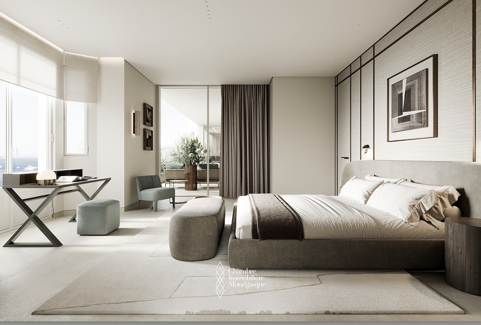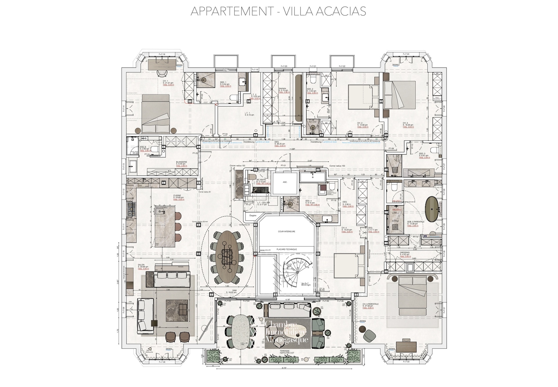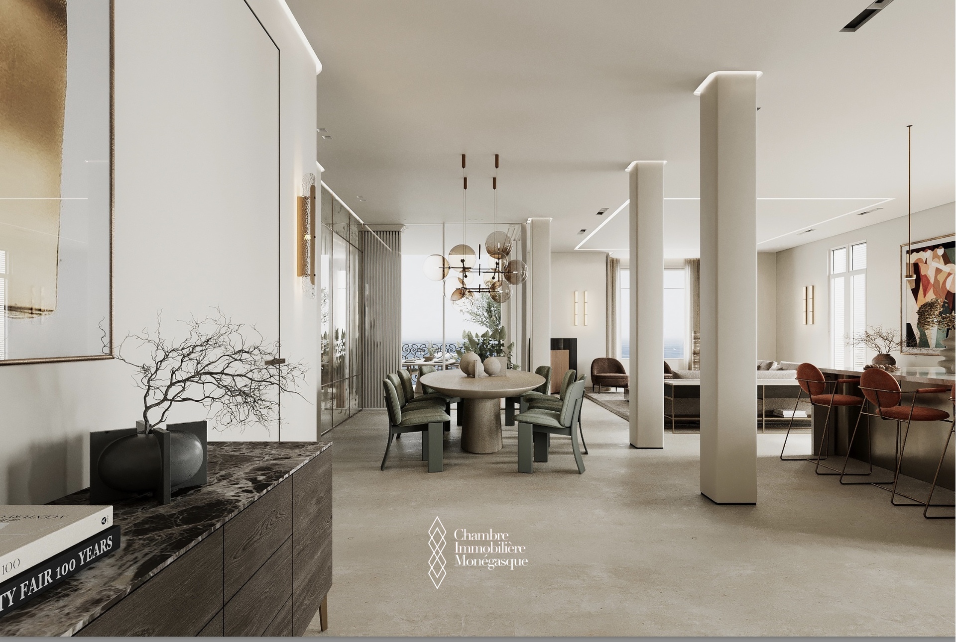 Cet appartement d'exception, actuellement en cours de construction, se distingue par son emplacement prestigieux et son cadre de vie privilégié au cœur de Monaco. L'appartement est accessible par deux entrées : depuis le Boulevard des Moulins et l'Avenue de Grande Bretagne, directement sur l'une des plus belles places de la Principauté, le Square Winston Churchill. Cet emplacement permet d'accéder à des boutiques de luxe exclusives, à des restaurants haut de gamme et à la place du Casino, mondialement connue. Cette propriété unique s'étend sur tout l'étage et offre une vue panoramique à 360° à couper le souffle. L'intérieur se distingue par une hauteur de plafond de plus de 3 mètres, ce qui confère à l'appartement une ambiance élégante et majestueuse. L'une des caractéristiques les plus remarquables de cet appartement sont les baies vitrées du sol au plafond, qui s'escamotent partiellement et offrent ainsi une ouverture aérée. Vous pourrez ainsi profiter pleinement de la vue imprenable sur la mer avec vos invités sur la terrasse. Les matériaux nobles et soigneusement sélectionnés confèrent à cet appartement un charme unique et en font un véritable joyau de la Principauté, où raffinement et luxe se côtoient harmonieusement. Un ascenseur privé menant directement à l'appartement vous garantit une intimité totale et un confort inégalé. Les travaux de construction devraient s'achever en avril 2026 et vous présenteront un bien d'exception qui sera sans aucun doute l'un des plus beaux de Monaco. Si vous êtes intéressé, vous aurez encore la possibilité de personnaliser le design intérieur selon vos souhaits pendant la phase de construction.