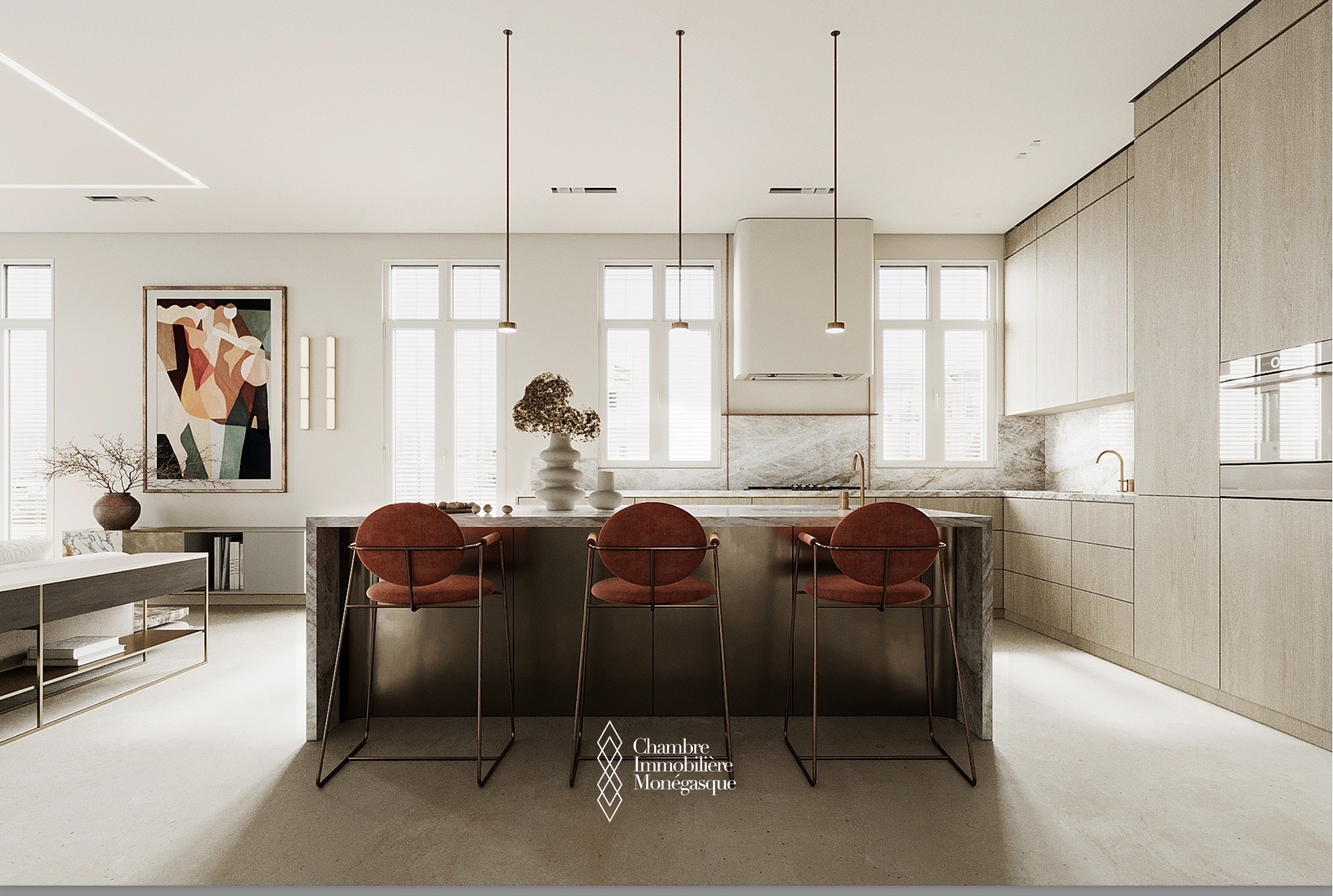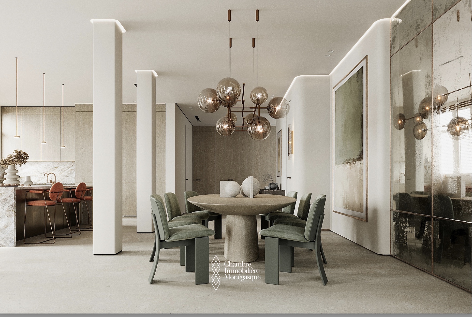 Un double salon spacieux et lumineux avec coin repas s'ouvre sur une cuisine ouverte entièrement équipée qui répond aux exigences les plus élevées en matière de confort et de fonctionnalité.