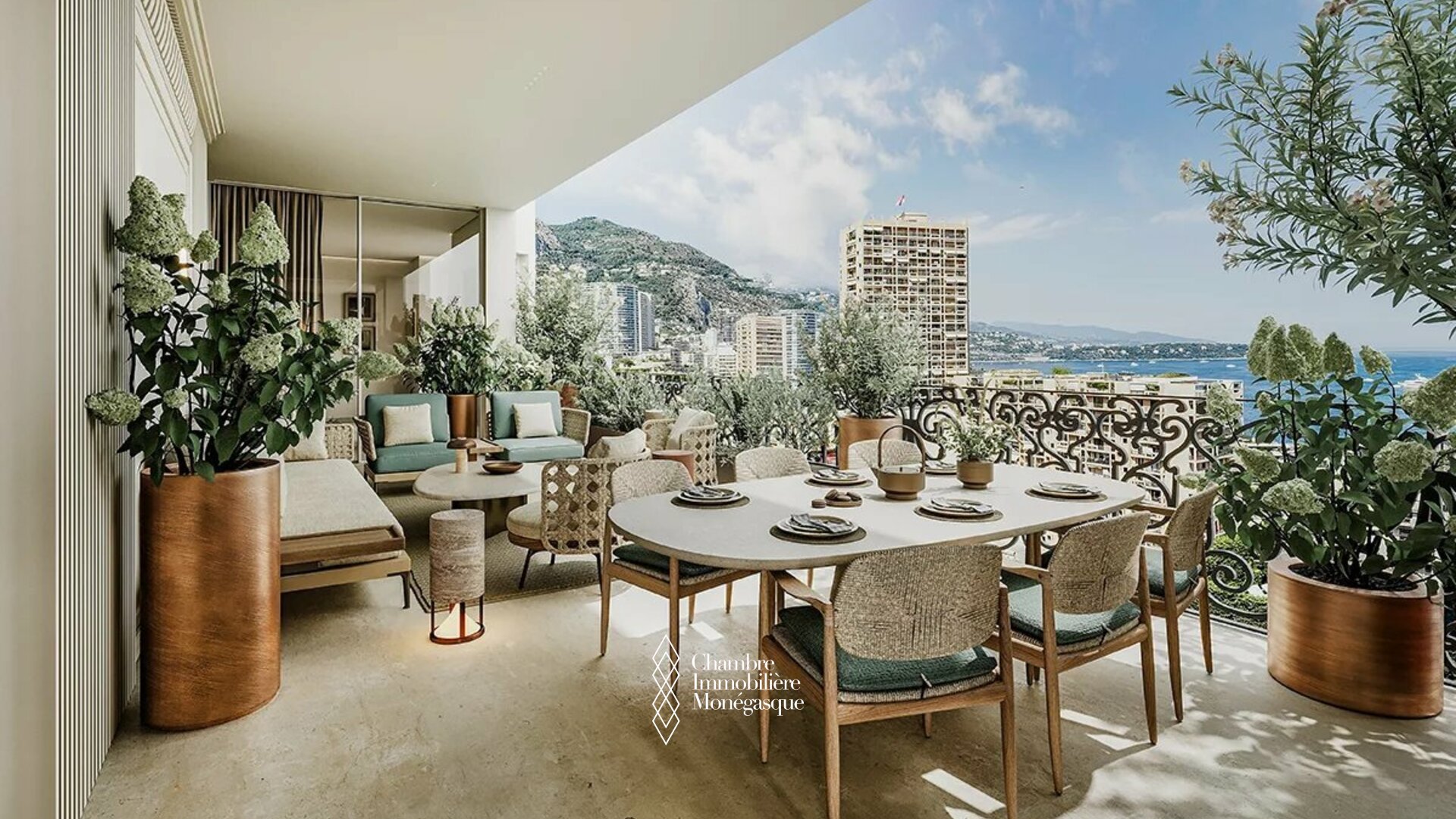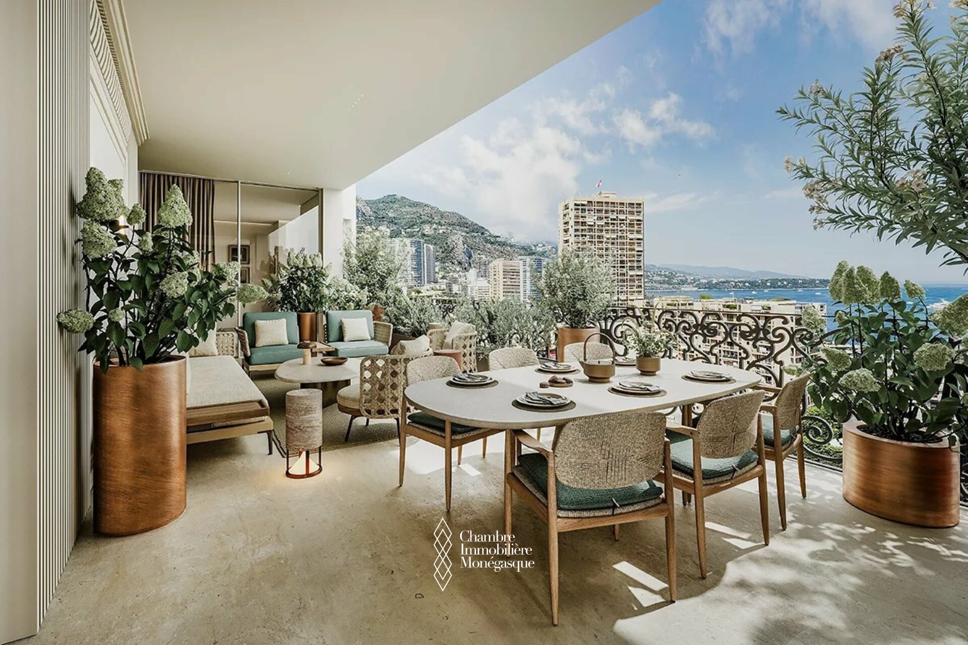 La terrasse spacieuse offre une vue panoramique époustouflante sur la mer, tandis que les loggias offrent une vue magnifique sur la ville.