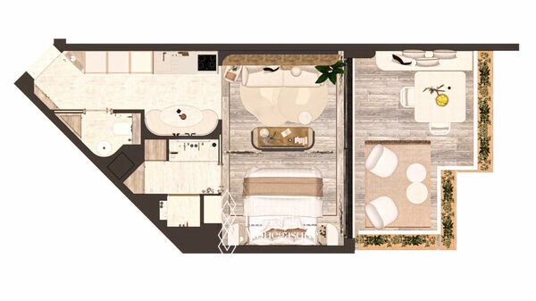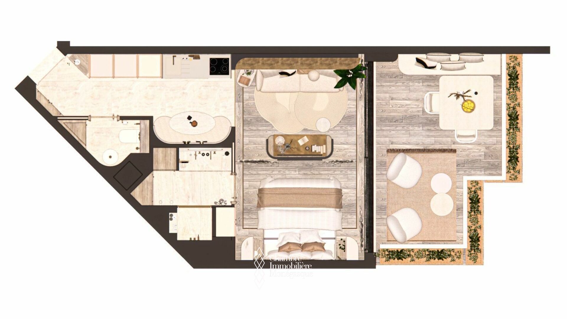 L'appartement est composée d'une entrée, un toilette invité, une cuisine équipée, un coin salon avec coin repas, un coin chambre, une salle de douche et une terrasse de 18 m2.