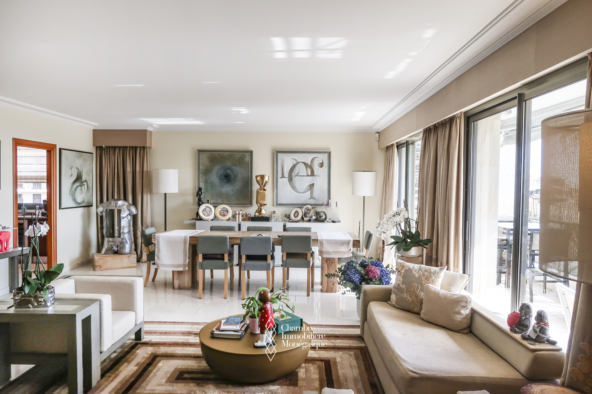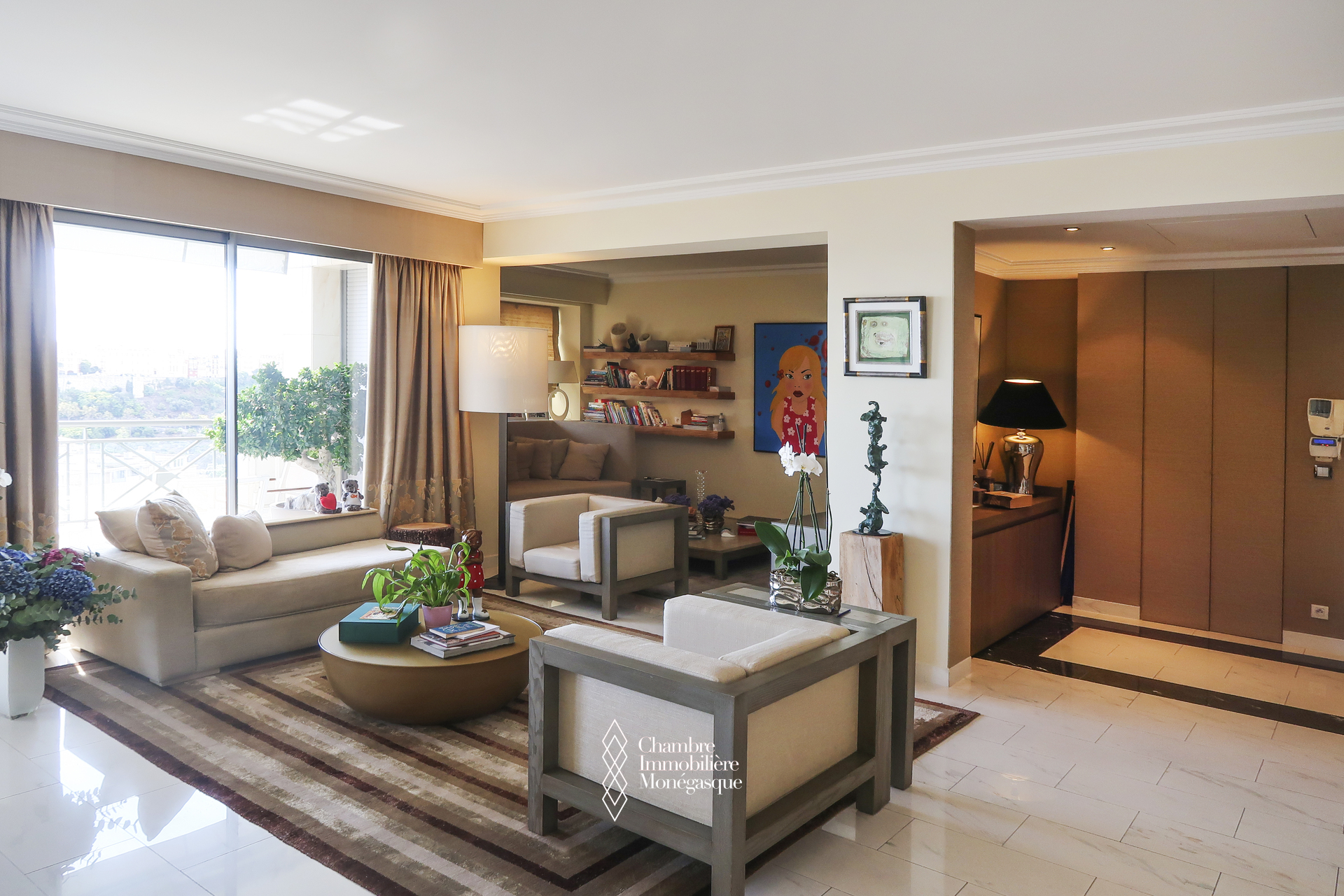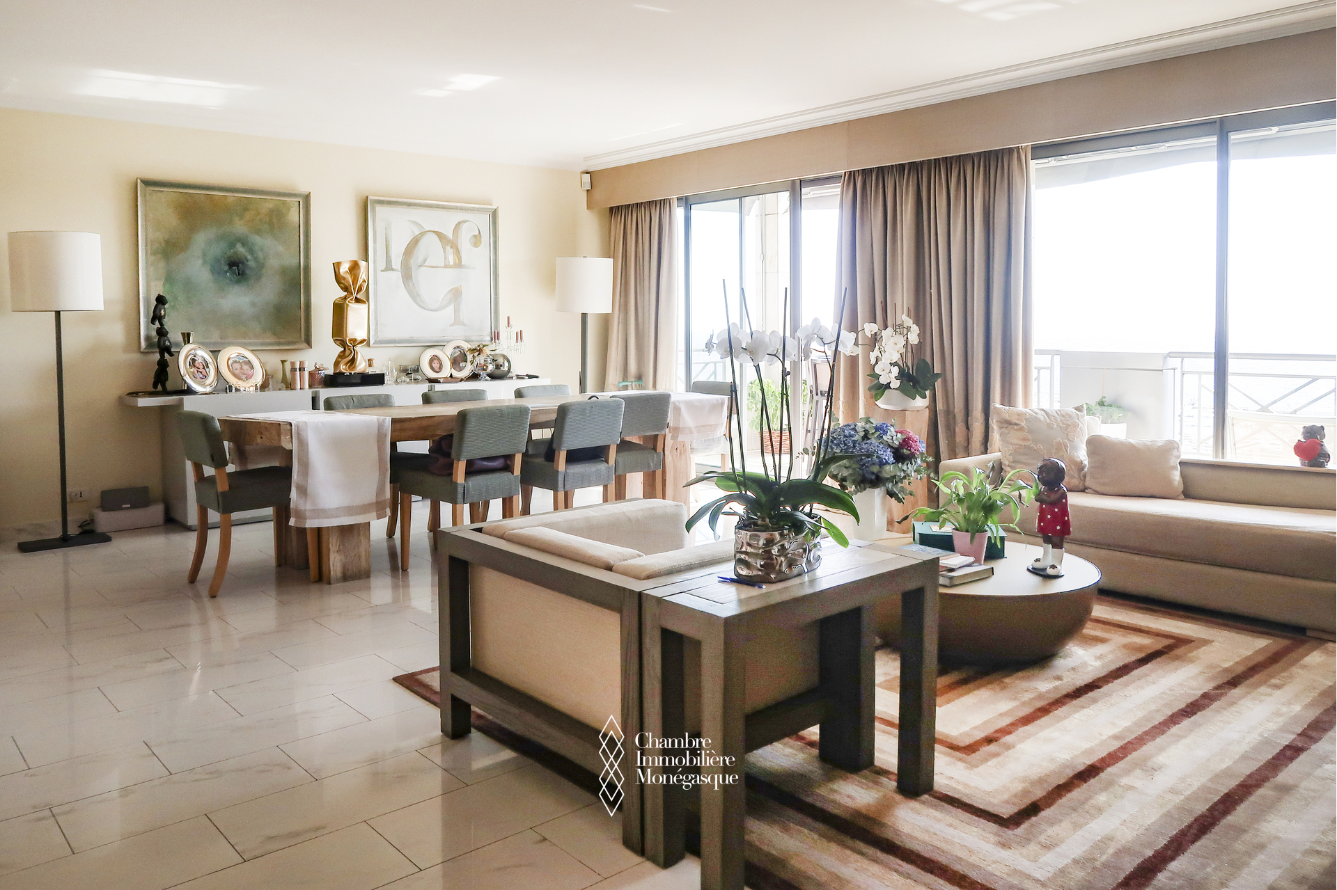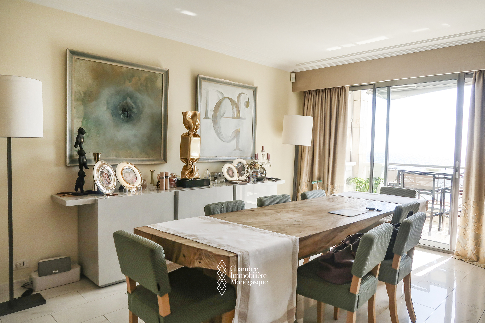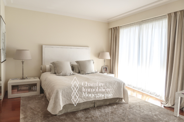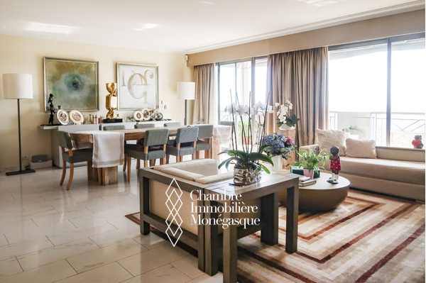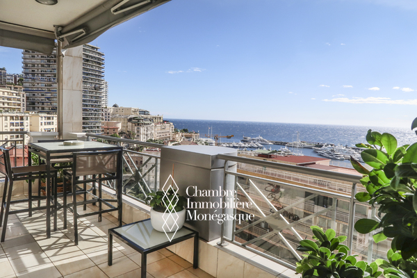Ce triplex traversant est composé d'une entrée donnant sur un double séjour - salle à manger, donnant accès à une profonde terrasse avec vue sur le Port Hercule, une cuisine indépendante, une buanderie/cellier permettant un rangement supplémentaire et qui était initialement une chambre à coucher, un toilette invité.