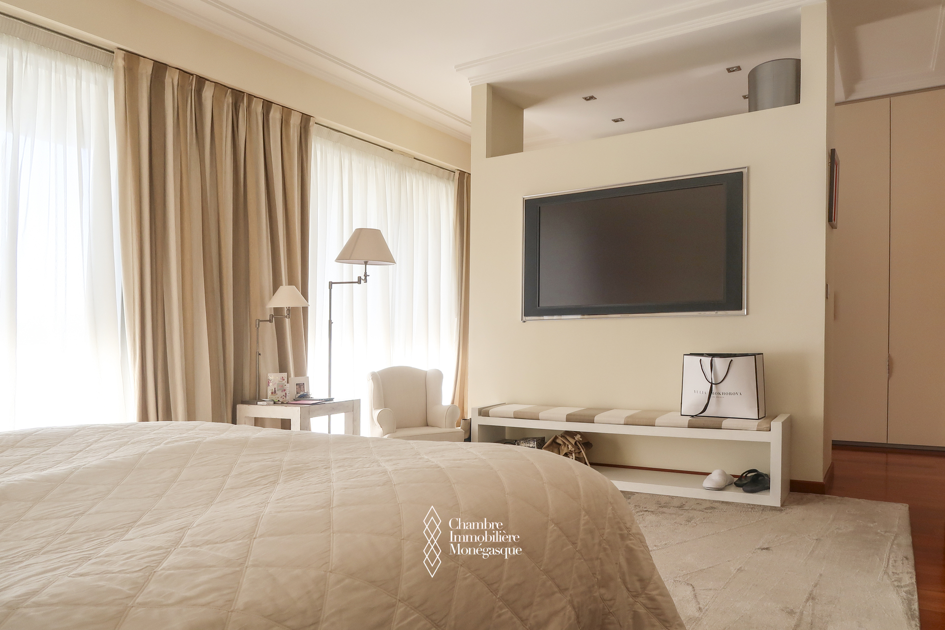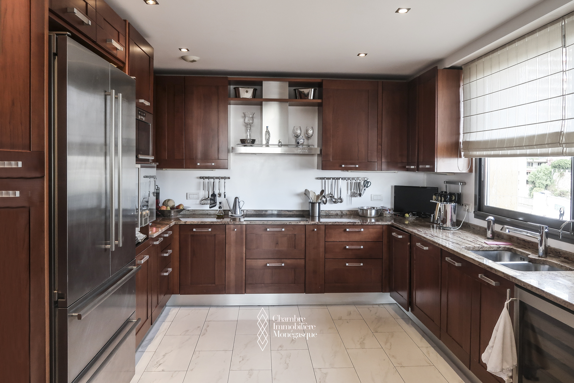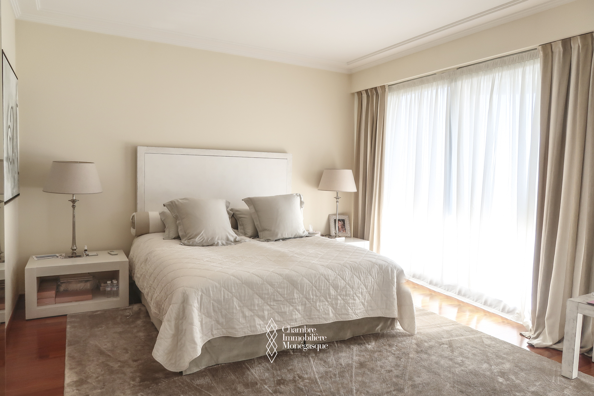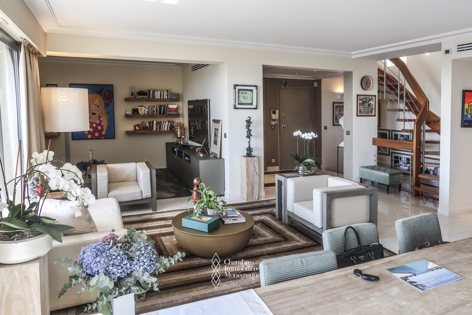 Ce triplex traversant est composé d'une entrée donnant sur un double séjour - salle à manger, donnant accès à une profonde terrasse avec vue sur le Port Hercule, une cuisine indépendante, une buanderie/cellier permettant un rangement supplémentaire et qui était initialement une chambre à coucher, un toilette invité.
