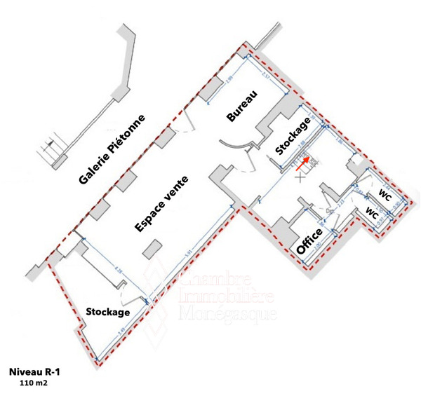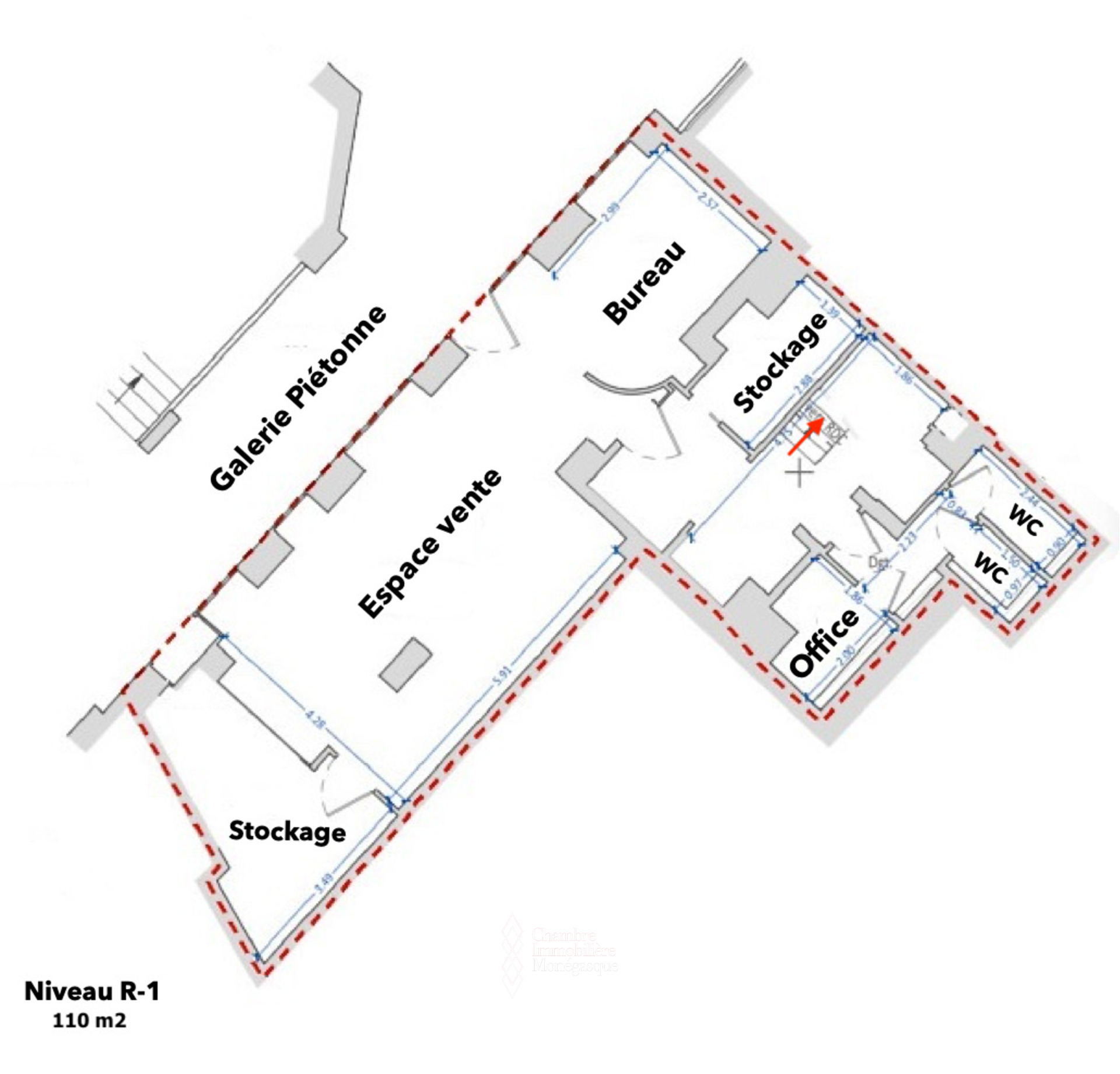 Surface totale : 180 m2 (Rez-de-chaussée : espace de vente : 70 m2 environ) + (Niveau inférieur : bureau, espace de vente, espace de stockage, coin cuisine, sanitaires homme/femmes : 110 m2  environ)