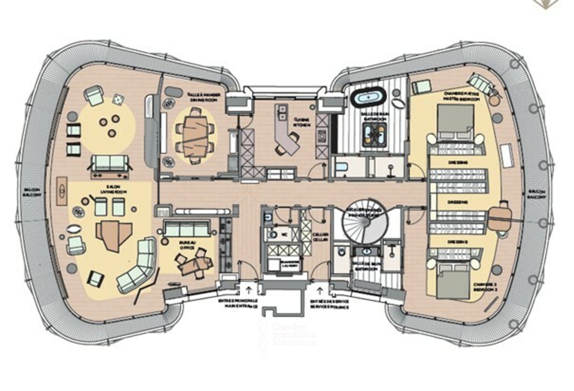 • un hall d’entrée, un salon avec vue sur le Casino et la mer, une salle à manger, une cuisine équipée, 2 chambres en suite et dressings face à l’Hôtel Hermitage, une entrée personnel séparée avec une buanderie équipée, Toilettes invités