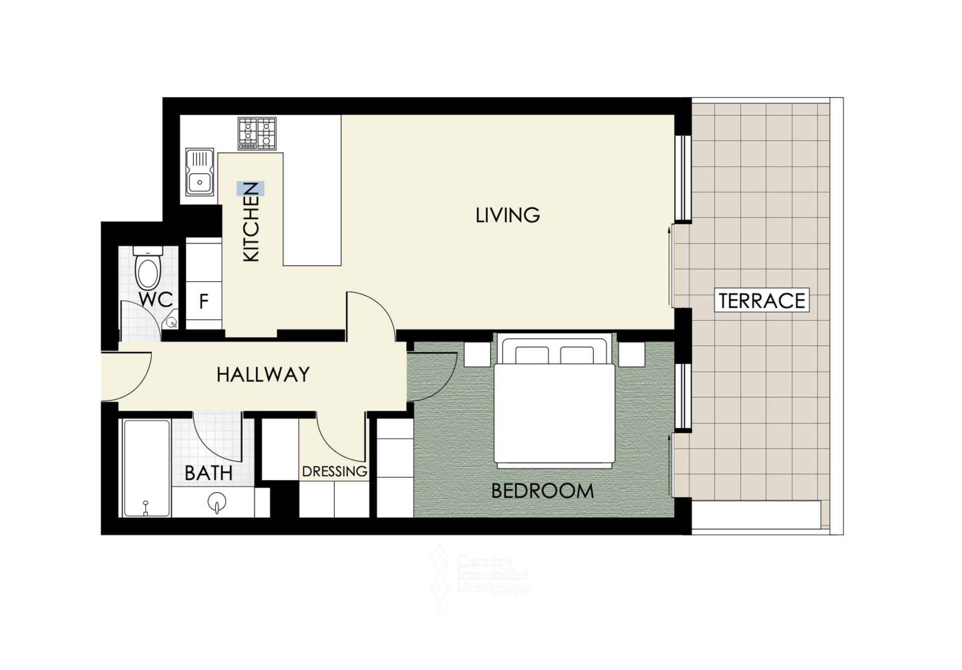 L’appartement offre une distribution agréable avec une entrée, un séjour lumineux doté d’une cuisine ouverte avec comptoir, et une chambre équipée de rangements intégrés. Les deux pièces donnent sur une grande terrasse, apportant une belle continuité entre l’intérieur et l’extérieur. Une salle de douche moderne ainsi qu’un toilette invités complètent le bien.