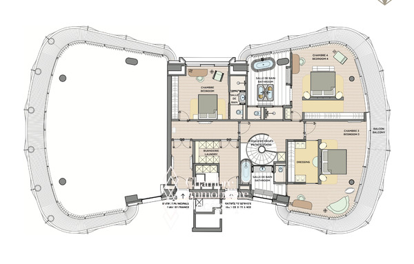 Étage inférieur: hall d’entrée, salon spacieux, salle à manger donnant sur une immense terrasse circulaire, bureau, entrée de service avec rangement, cuisine équipée indépendante, 2 chambres avec dressing attenant et salles de bains/douche s’ouvrant sur une terrasse spacieuse, wc d'invité