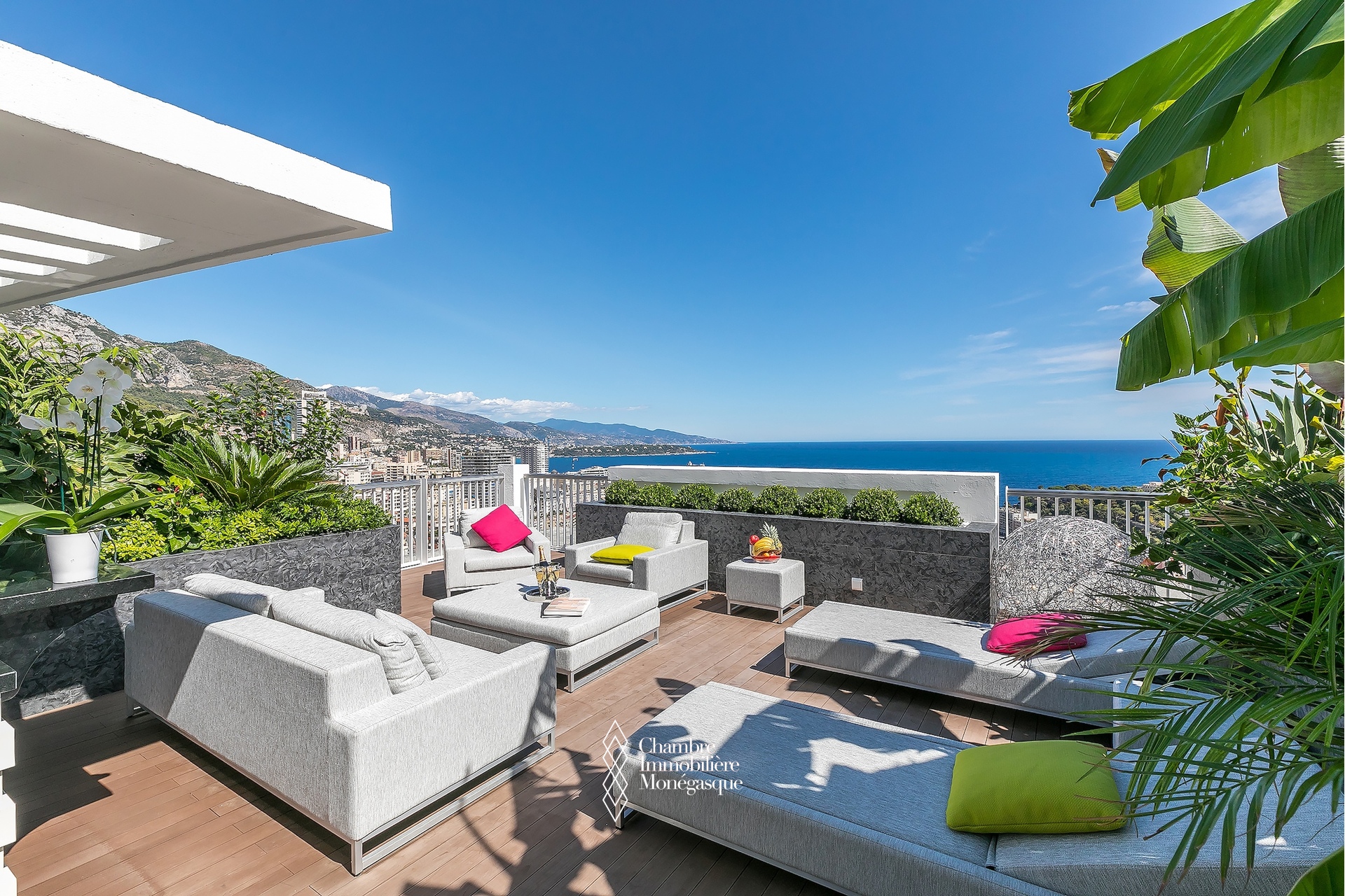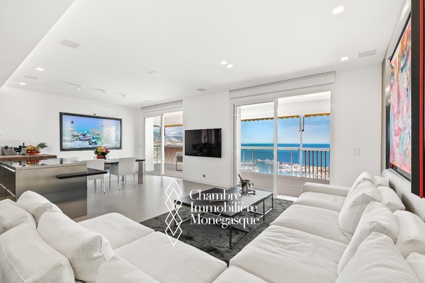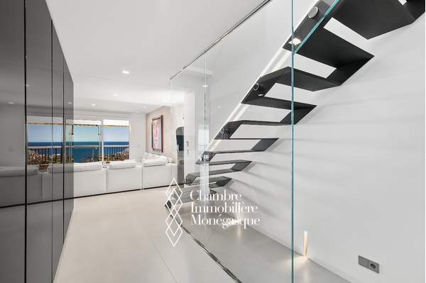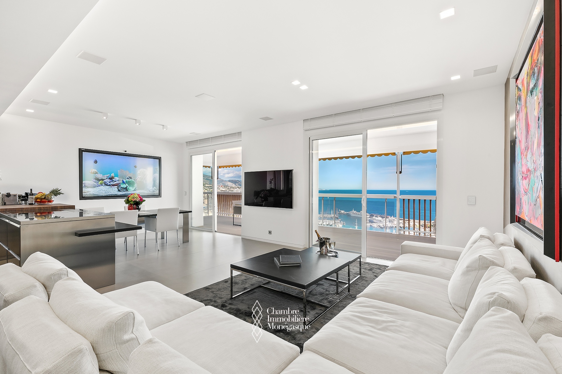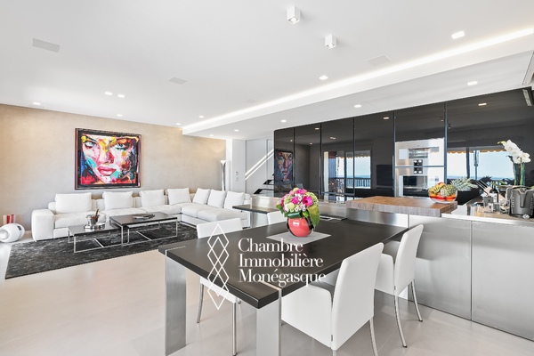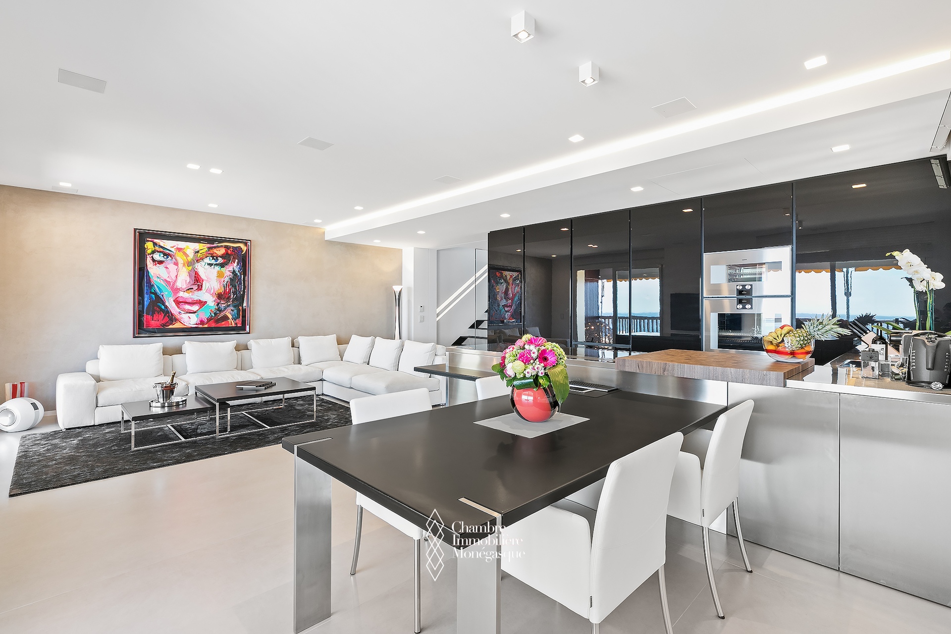 EXCLU - La magnificence de ce duplex Penthouse se révèle au seuil du vaste et lumineux séjour, baigné de lumière et offrant une vue à couper le souffle sur Monaco et la Grande Bleue, au travers de grandes baies vitrées.