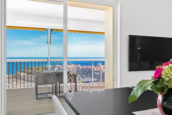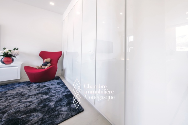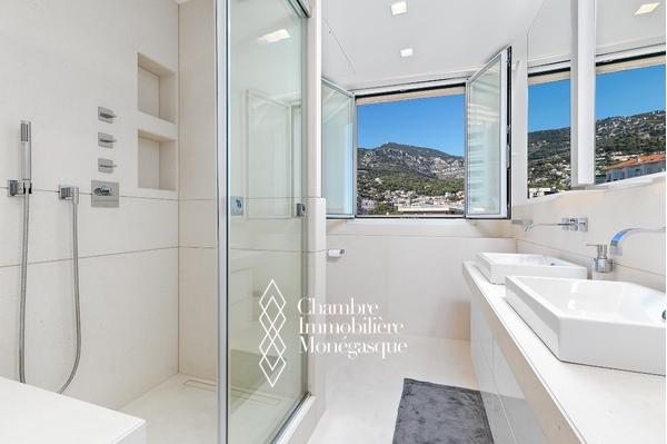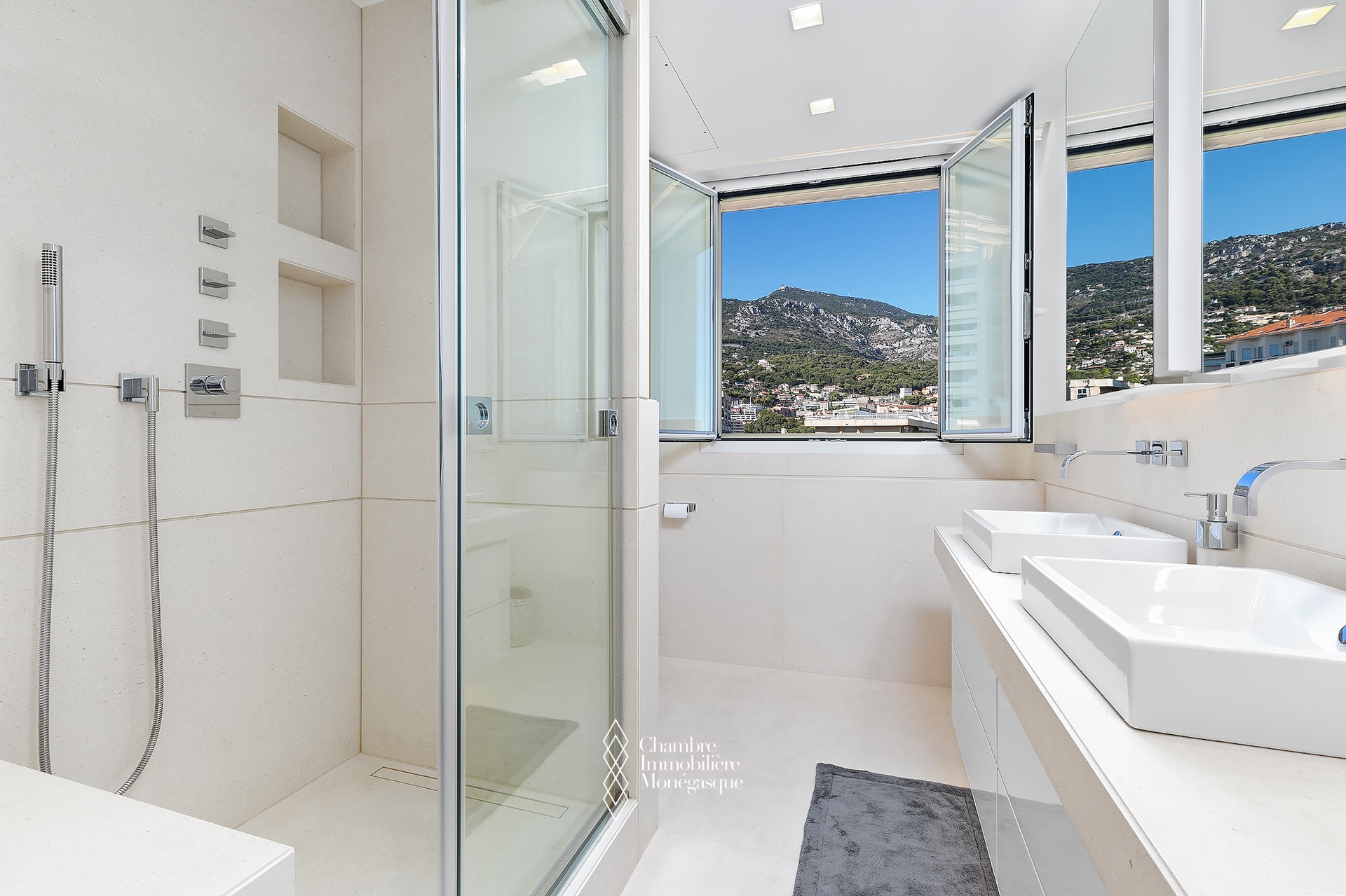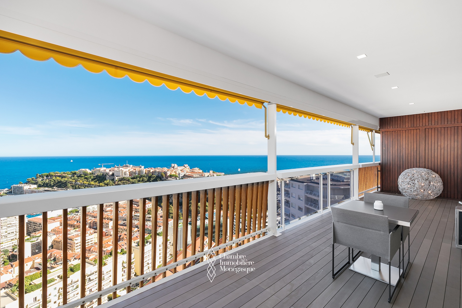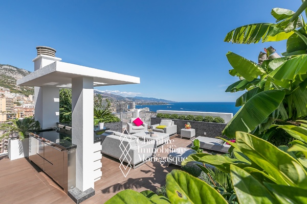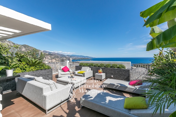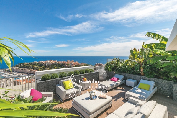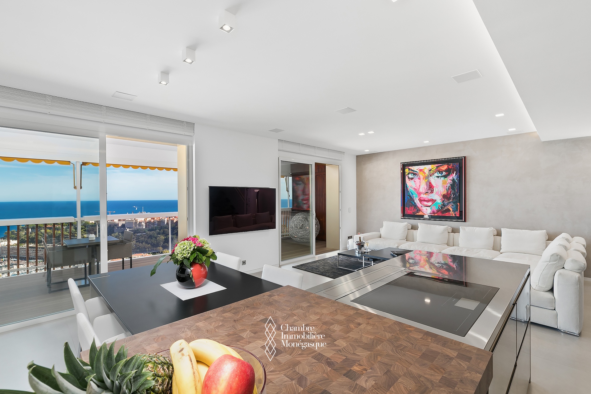 EXCLU - La magnificence de ce duplex Penthouse se révèle au seuil du vaste et lumineux séjour, baigné de lumière et offrant une vue à couper le souffle sur Monaco et la Grande Bleue, au travers de grandes baies vitrées.