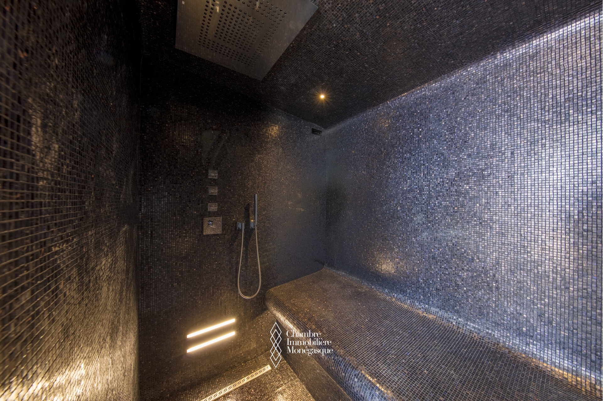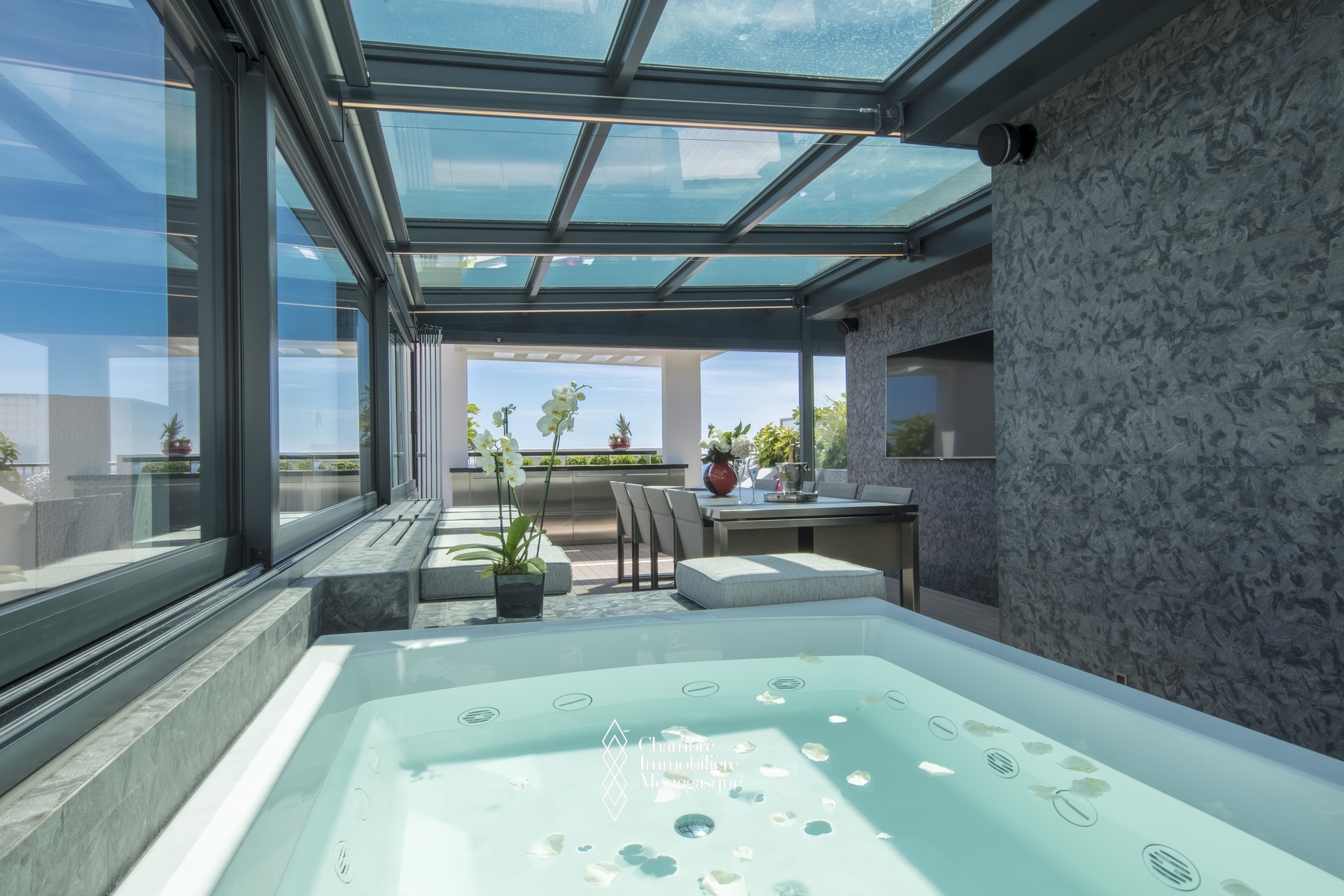 La véranda dévoile un espace repas entièrement équipé avec télévision, système audio, stores électriques et climatisation, le tout contrôlé par un système domotique. Elle comprend également un jacuzzi, une salle d'eau, et un luxueux hammam avec un système de chromothérapie.
