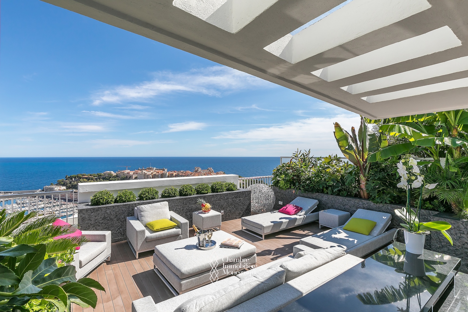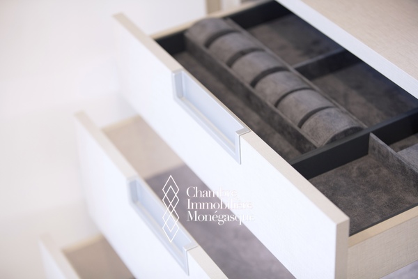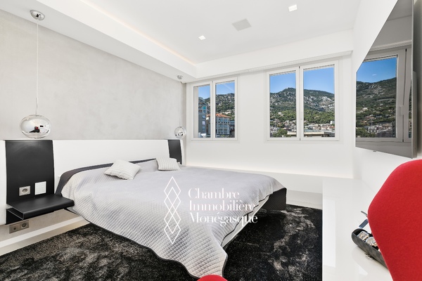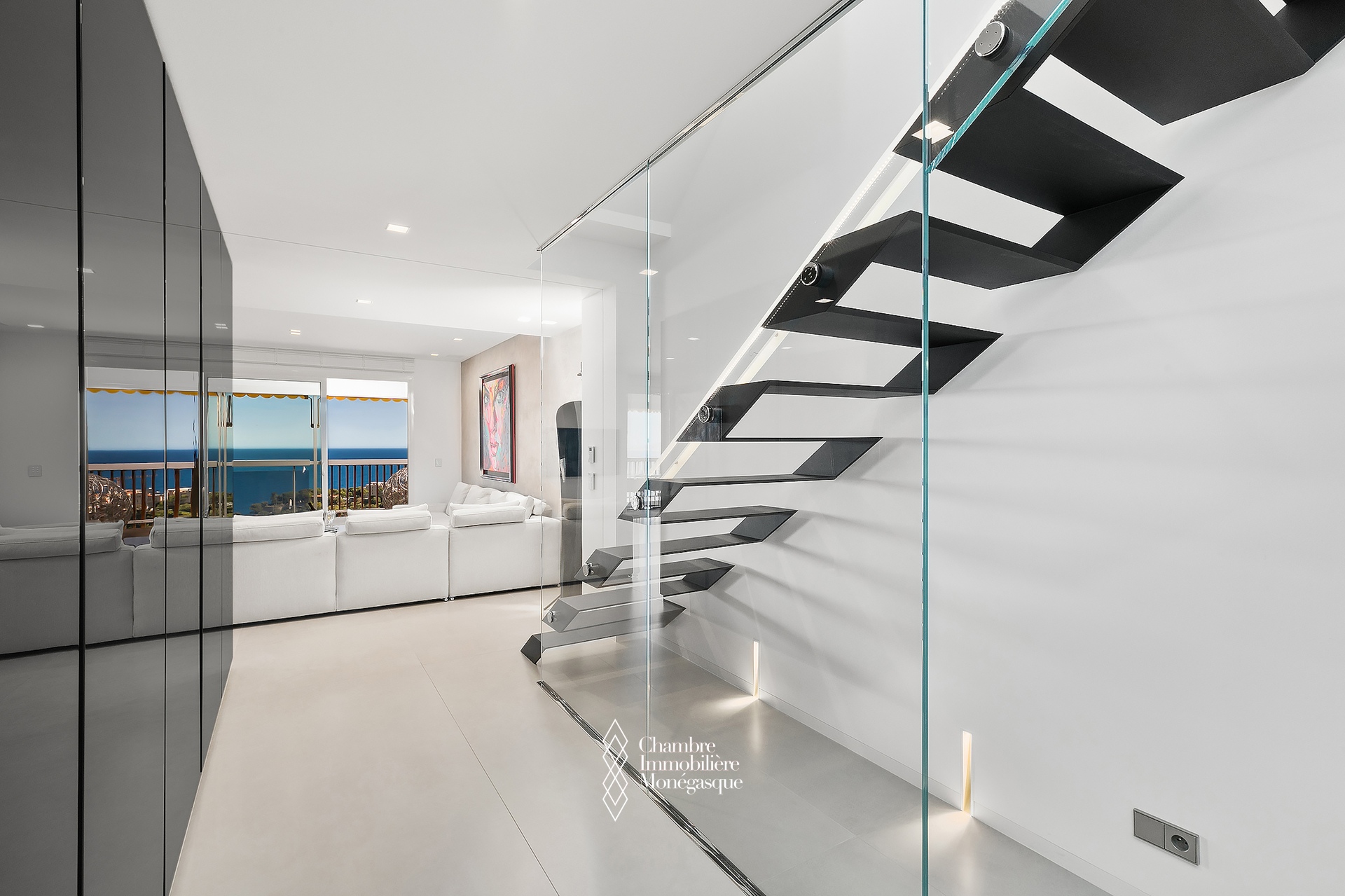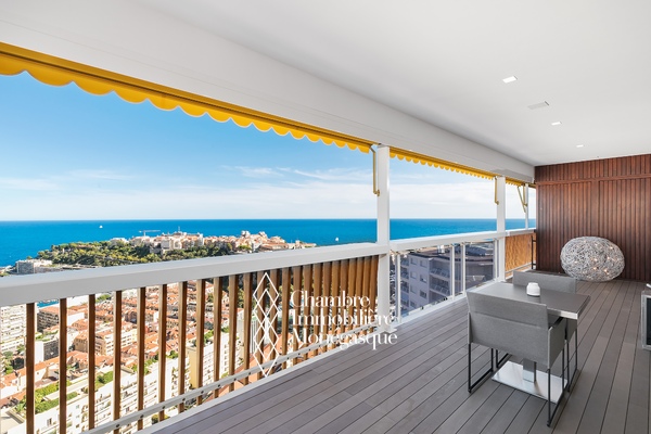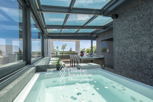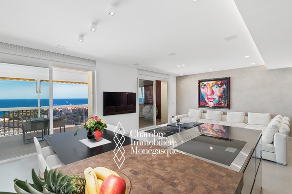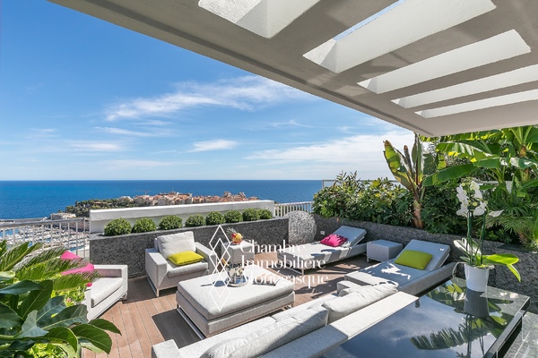 EXCLU - La magnificence de ce duplex Penthouse se révèle au seuil du vaste et lumineux séjour, baigné de lumière et offrant une vue à couper le souffle sur Monaco et la Grande Bleue, au travers de grandes baies vitrées.