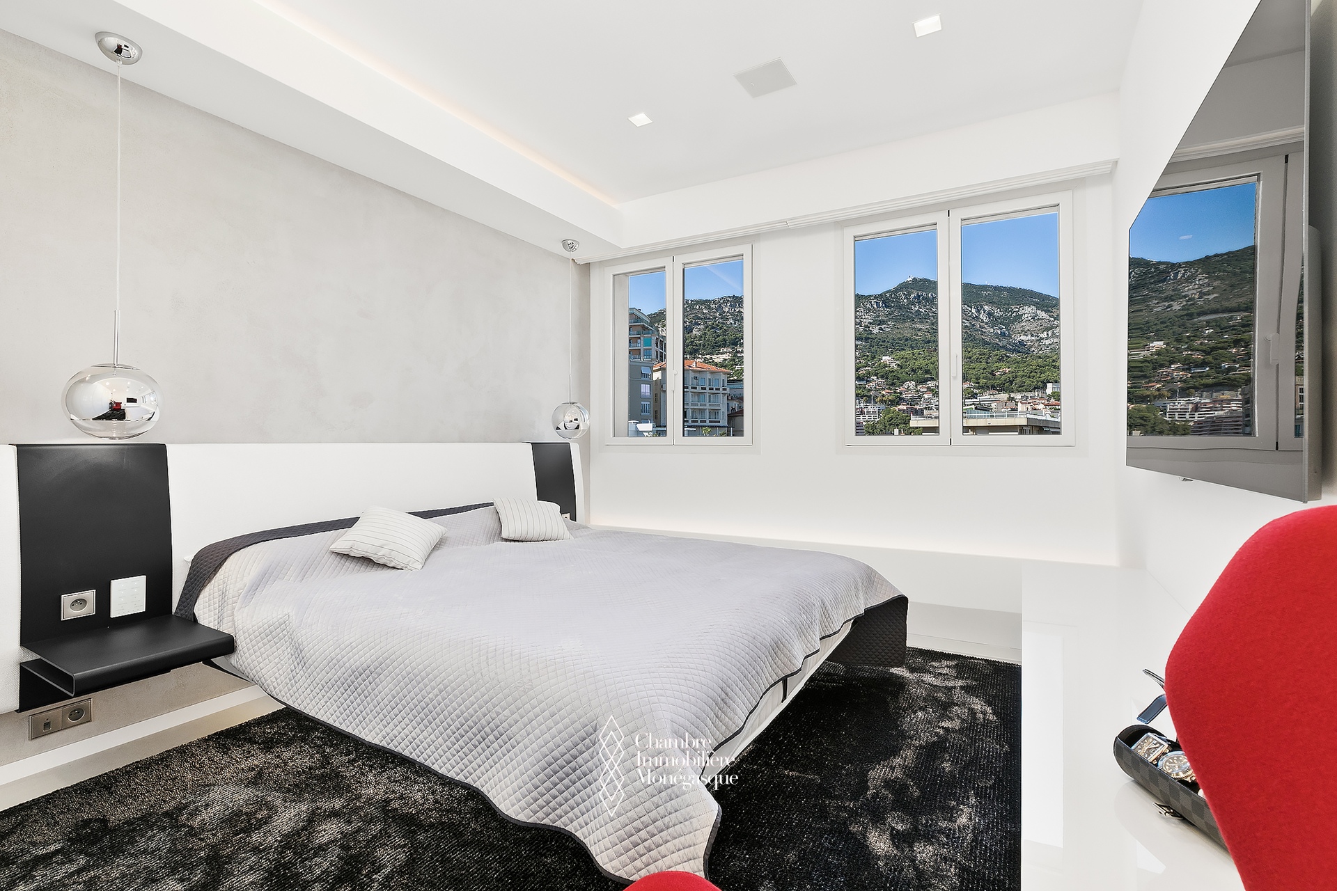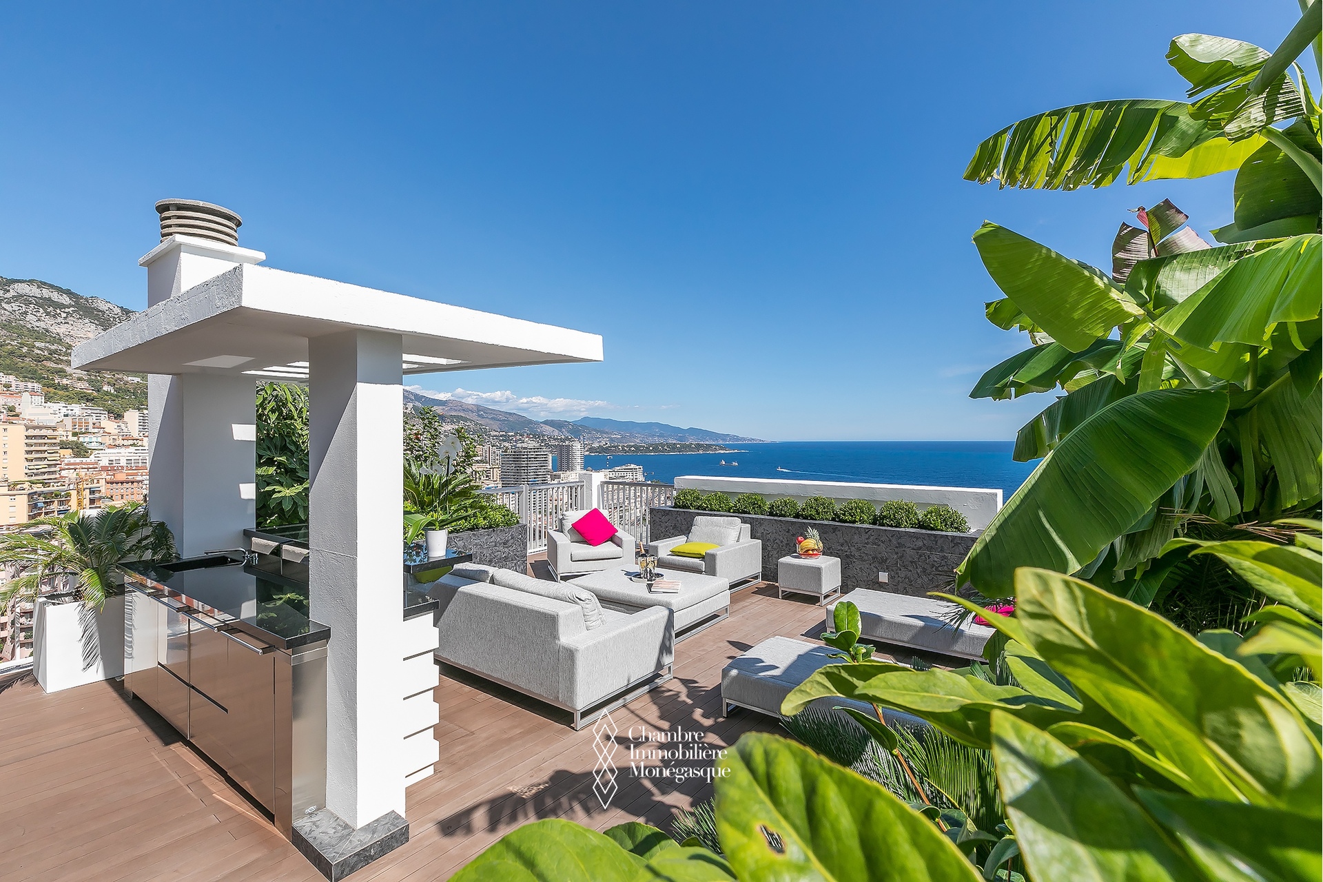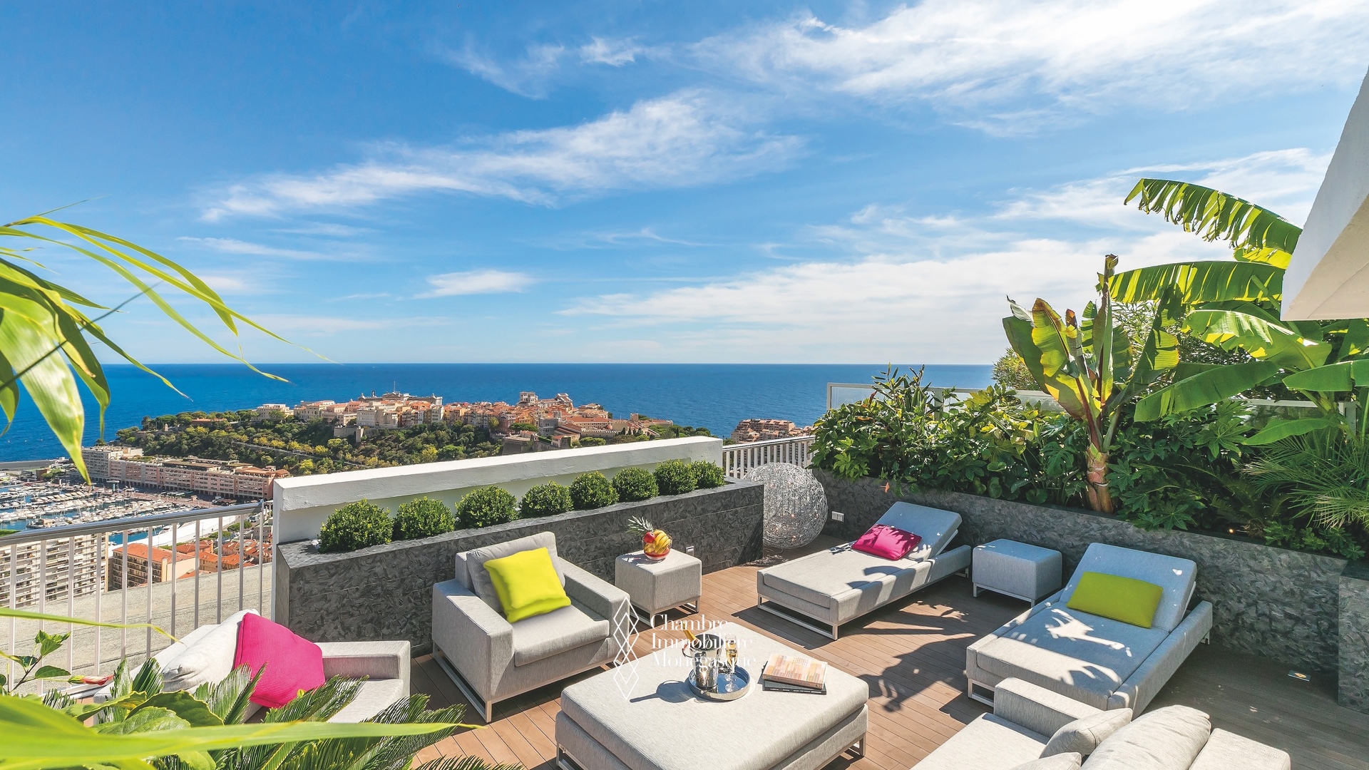EXCLU - La magnificence de ce duplex Penthouse se révèle au seuil du vaste et lumineux séjour, baigné de lumière et offrant une vue à couper le souffle sur Monaco et la Grande Bleue, au travers de grandes baies vitrées.