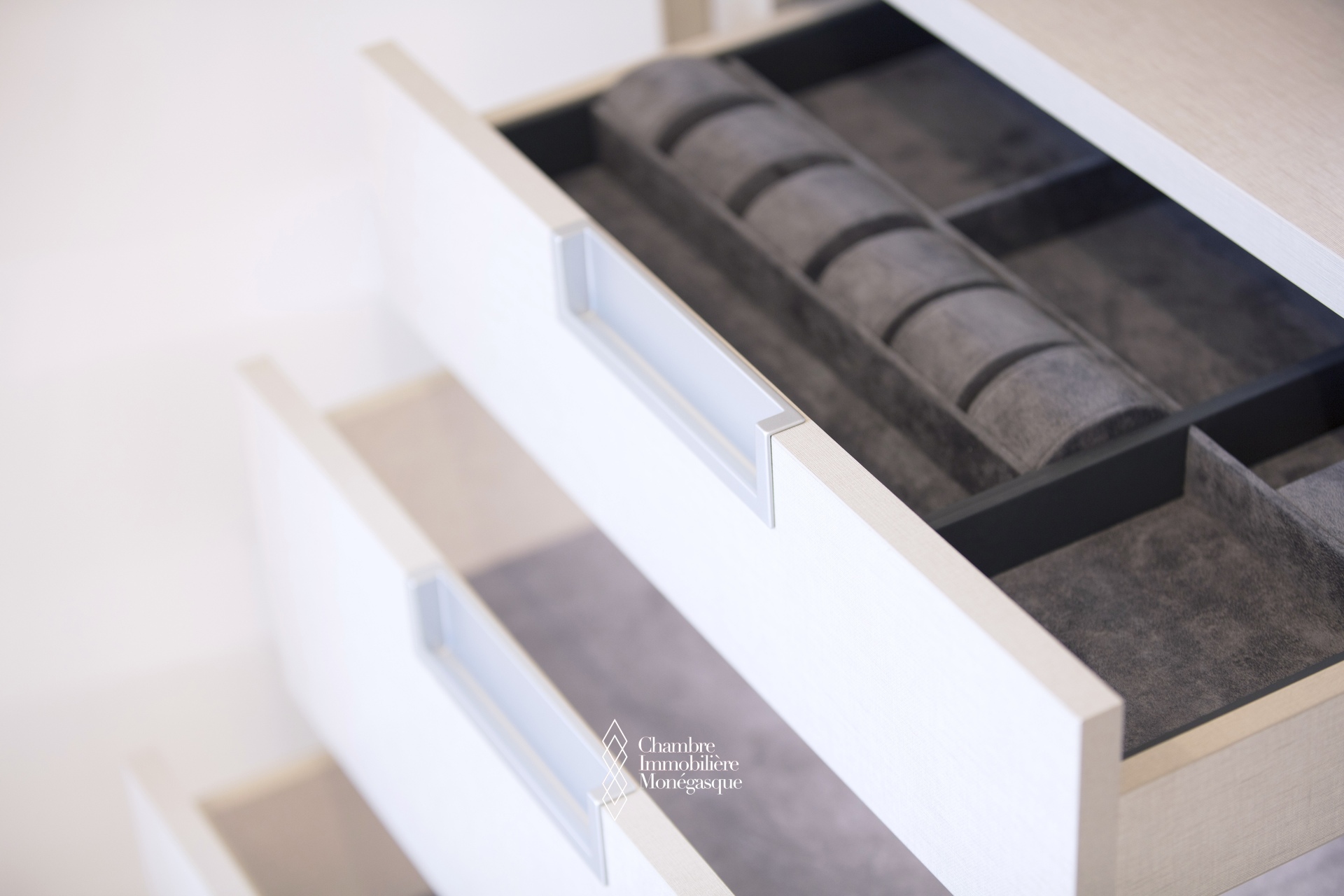 Les matériaux soigneusement sélectionnés créent une continuité et une sensation de légèreté. Les surfaces réfléchissantes—comme la laque brillante, les métaux, les résines de ciment et le marbre naturel—sont habilement intégrées dans l’ensemble du design.