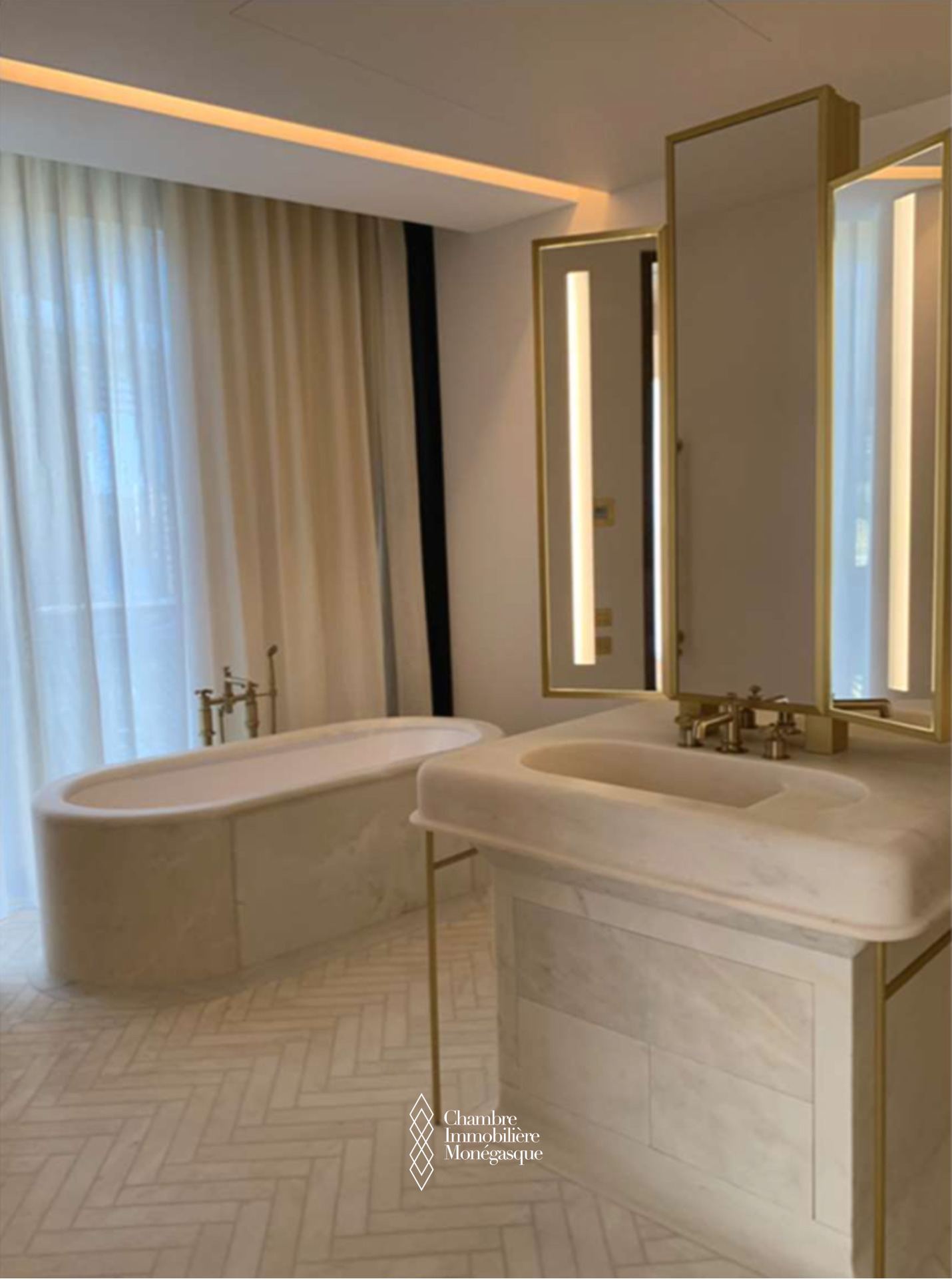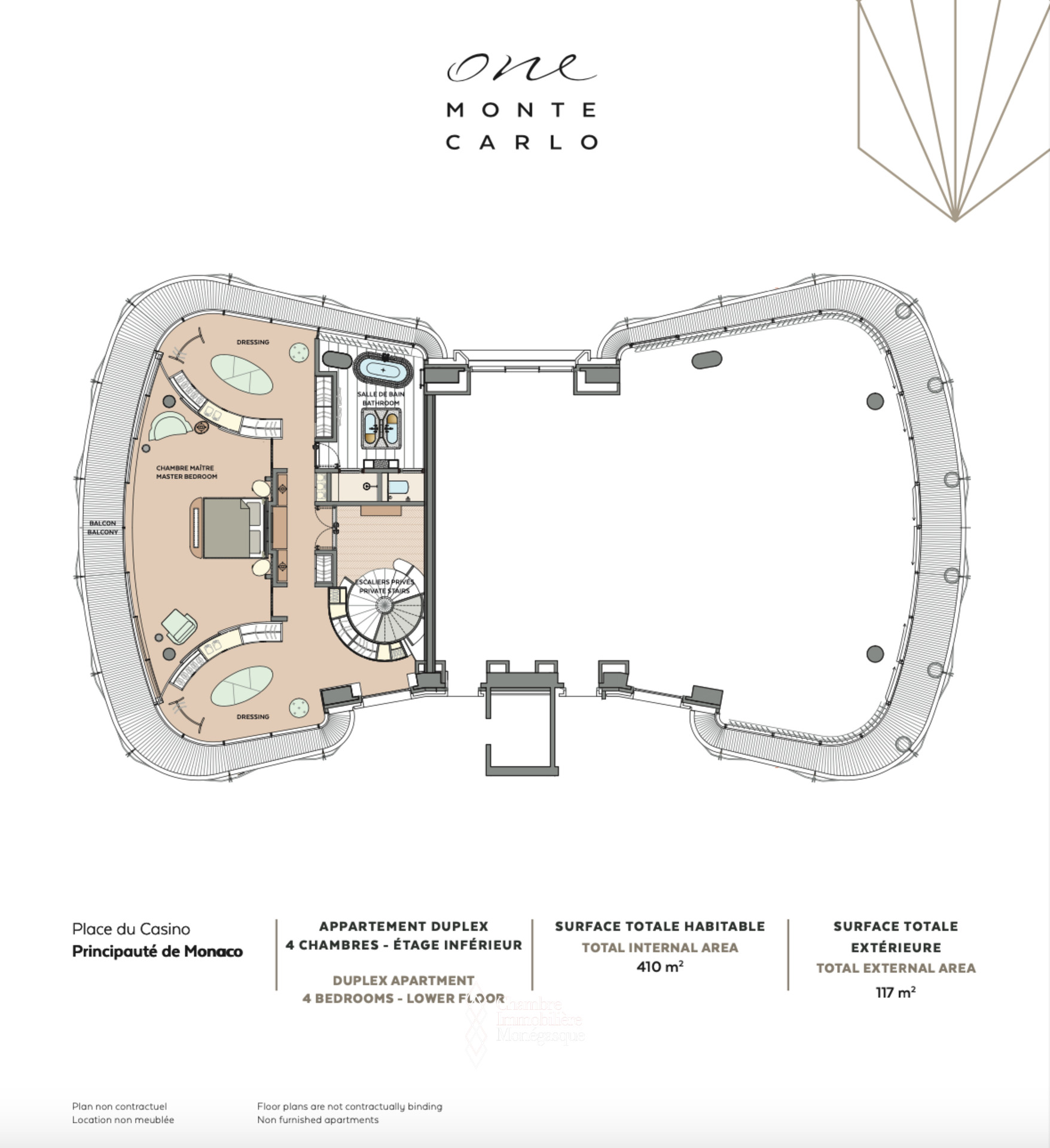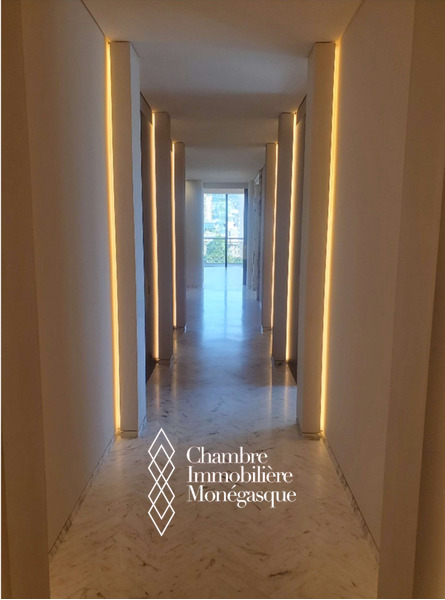 - au 4ème étage: un hall d'entrée donnant sur un salon avec vue sur le Casino et la mer, une salle à manger, une cuisine équipée séparée, 3 chambres avec salle de bain et dressing face à l'hôtel Hermitage, une entrée séparée pour le personnel avec une buanderie équipée et des toilettes invités.