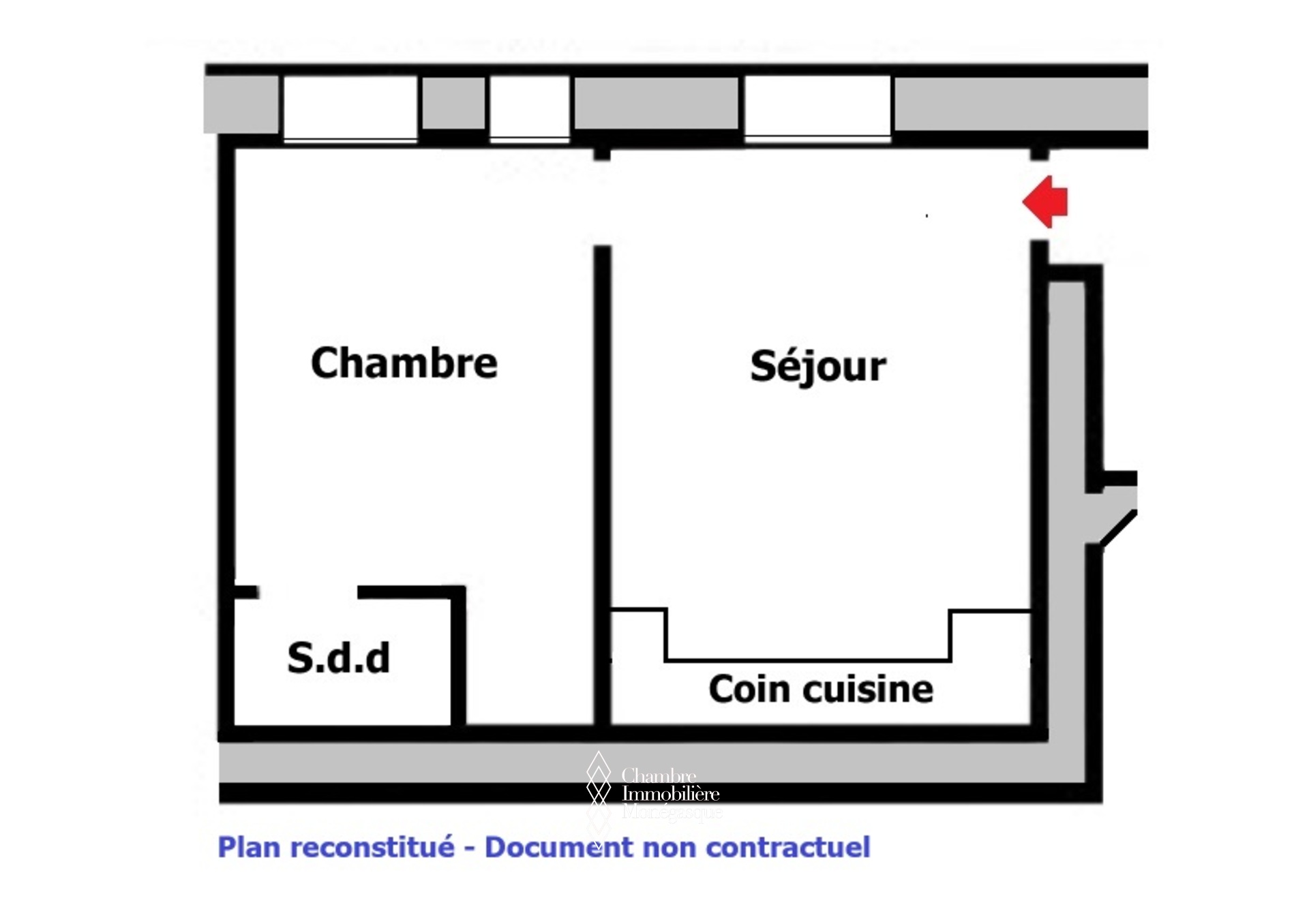 Entrée, séjour avec cuisine équipée, chambre, salle de douche complète